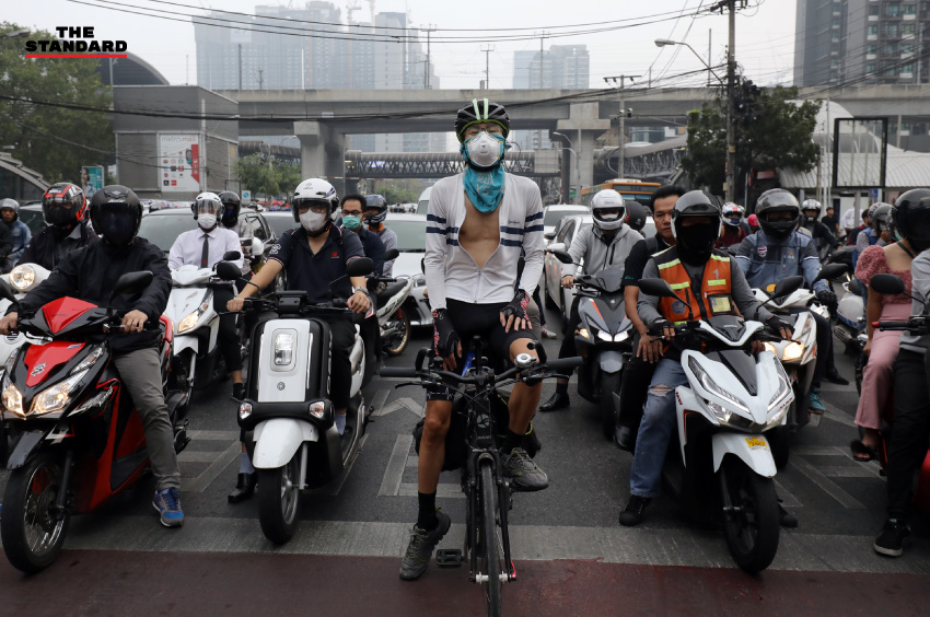 นักปั่นจักรยานและผู้ใช้รถจักรยานยนต์ ต่างสวมหน้ากากอนามัย เพื่อปกป้องร่างกายจากการสูดดมอากาศที่ไม่บริสุทธิ์ จากการรายงานของ AirVisual แบบเรียลไทม์ เมื่อวันที่ 21 มกราคม 2563 ช่วงเวลา 09.00 น. พบว่า มีปริมาณฝุ่นตรวจจับได้ที่ 176 US AQI และเมื่อแยกเป็นเฉพาะฝุ่น PM2.5 พบว่ามีค่าฝุ่นเฉลี่ยอยู่ที่ 104.8 ไมโครกรัมต่อลูกบาศก์เมตร