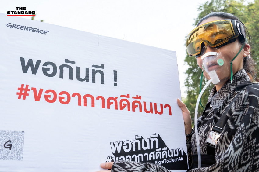 นักกิจกรรมสวมใส่หน้ากากพร้อมถือป้ายข้อความ ระหว่างร่วมกิจกรรม ‘พอกันที ขออากาศดีคืนมา’ เรียกร้องหน่วยงานภาครัฐเร่งแก้ไขวิกฤตฝุ่น PM2.5 โดยได้มีการยื่นหนังสือที่ศูนย์รับเรื่องราวร้องทุกข์ของรัฐบาล เพื่อส่งถึงนายกรัฐมนตรี เมื่อวันที่ 23 มกราคม 2563
