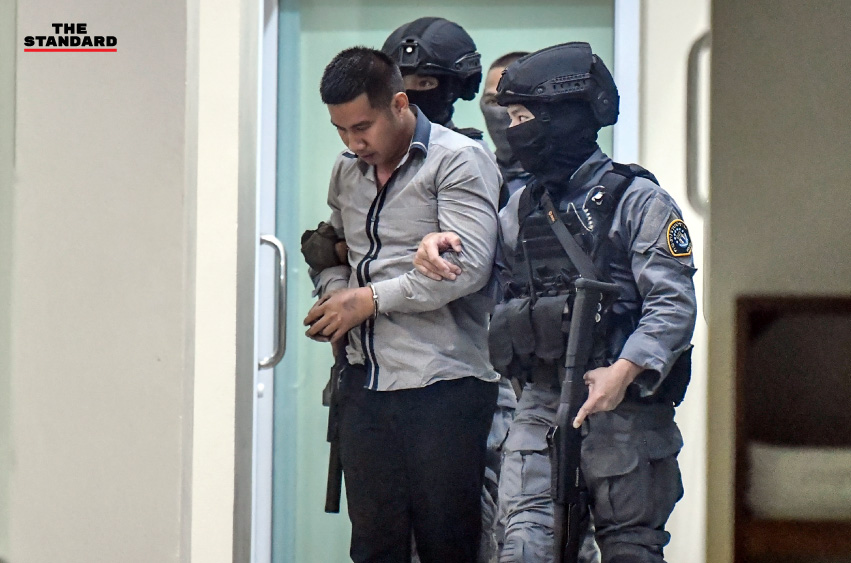 เจ้าหน้าที่ตำรวจควบคุมตัว ประสิทธิชัย เขาแก้ว ผู้ต้องหาคดีชิงทรัพย์ทองคำที่ร้านทองออโรร่า ห้างโรบินสัน จังหวัดลพบุรี ออกจากสถานีตำรวจท่องเที่ยวลพบุรี มุ่งหน้าสู่กองปราบปราม เมื่อวันที่ 23 มกราคม 2563 หลังเค้นสอบและนำชี้จุดต่างๆ ตลอดทั้งวัน