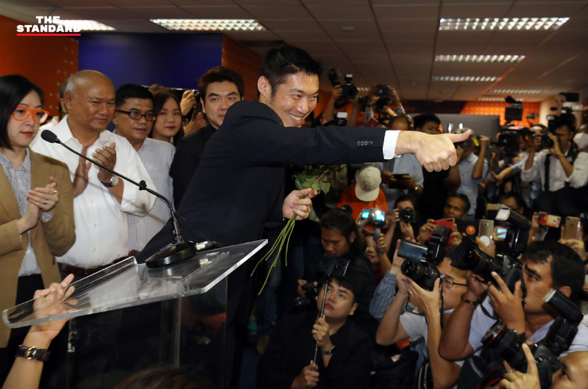 ธนาธร จึงรุ่งเรืองกิจ หัวหน้าพรรคอนาคตใหม่ แสดงท่าทางให้กับกลุ่มผู้สนับสนุนที่มาให้กำลังใจในที่ทำการพรรคอนาคตใหม่ หลังศาลรัฐธรรมนูญมีคำวินิจฉัยไม่ยุบพรรค เมื่อวันที่ 21 มกราคม 2563