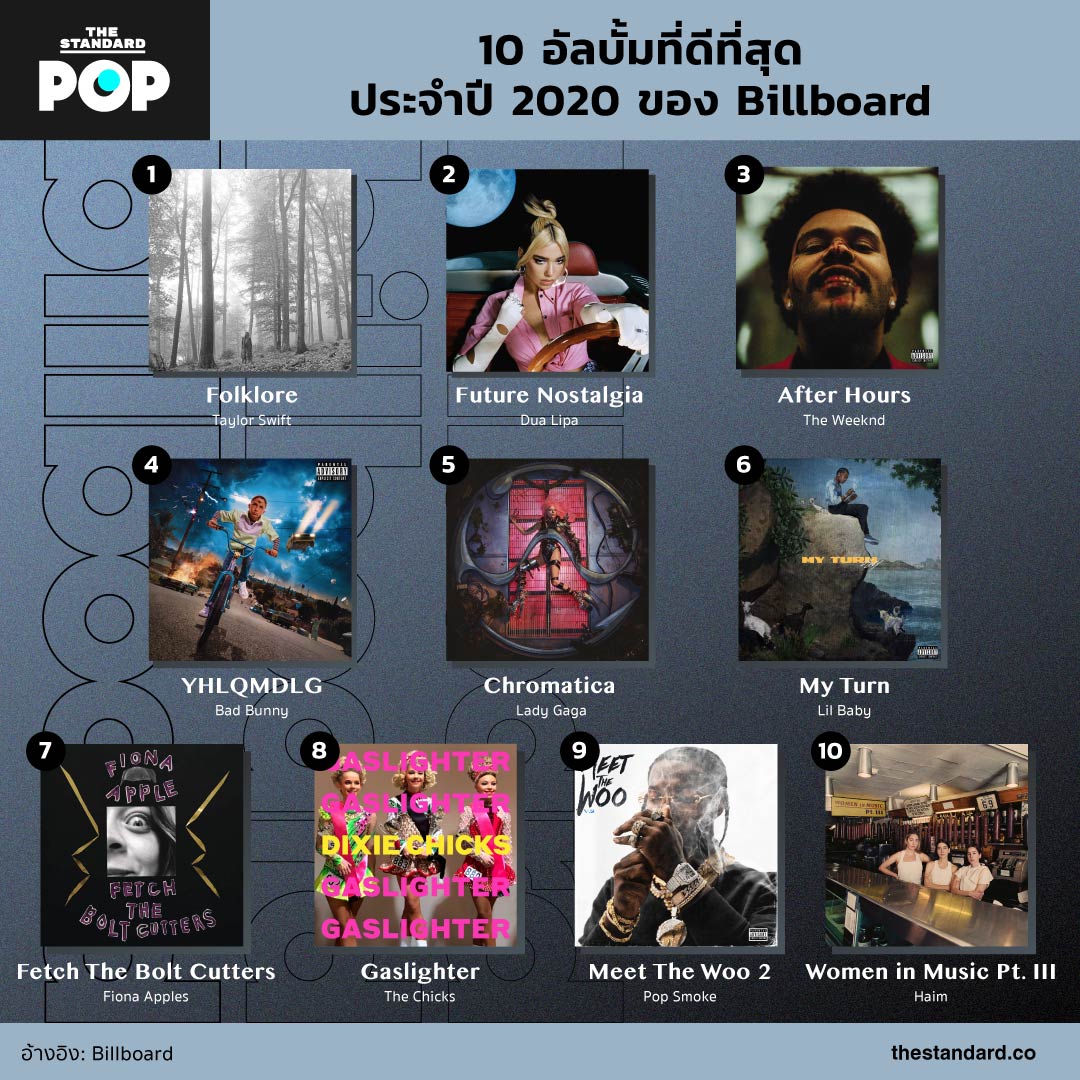 นอกเหนือจาก Rolling Stone, The New York Times และ Pitchfork อีกหนึ่งเว็บไซต์ที่มีความสำคัญทุกปีในการจัดอันดับผลงานที่ดีสุดประจำปีก็คือ Billboard ที่ล่าสุดได้เผย 50 อัลบั้มแห่งปี 2020 ซึ่งอันดับหนึ่งก็ตกเป็นของ Folklore ผลงานลำดับที่ 8 ของสาว Taylor Swift