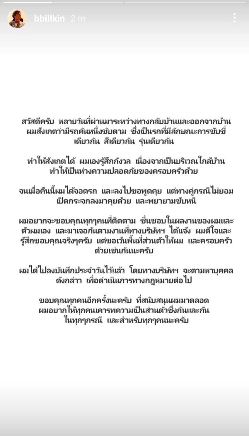 วันนี้ (10 กุมภาพันธ์) บิวกิ้น-พุฒิพงศ์ อัสสรัตนกุล ได้โพสต์ข้อความผ่านทาง IG Story ถึงกรณีที่มีบุคคลขับรถติดตามบิวกิ้นหลายครั้ง จนทำให้ตนเองเกิดความกังวลและเป็นห่วงความปลอดภัยของครอบครัว โดยล่าสุดทางบิวกิ้นและต้นสังกัด นาดาว บางกอก ได้ลงบันทึกประจำวันและจะตามหาบุคคลดังกล่าวเพื่อดำเนินการทางกฎหมายต่อไปเป็นที่เรียบร้อย พร้อมกล่าวขอบคุณแฟนๆ ที่ติดตามและให้กำลังใจเสมอมา และขอความร่วมมือจากแฟนๆ ให้เคารพความเป็นส่วนตัวซึ่งกันและกัน