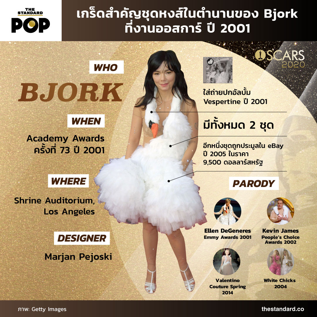 ในงานออสการ์ คงไม่มีชุดไหนที่ถูกล้อเลียนมากไปกว่าชุด Swan Dress ของศิลปินหญิงสุดแนวอย่าง บียอร์ก ที่เธอใส่ไปเดินพรมแดงงาน Academy Awards ปี 2001 ชุดเดรสพร้อมบอดี้สูทสีเนื้อที่ทำให้ตัวหงส์ทั้งตัวเหมือนกำลังพาดอยู่บนตัวเธอ สามารถเรียกเสียงวิจารณ์จากเหล่าแฟชั่นนิสต้าและคนบันเทิงได้อย่างอื้ออึง