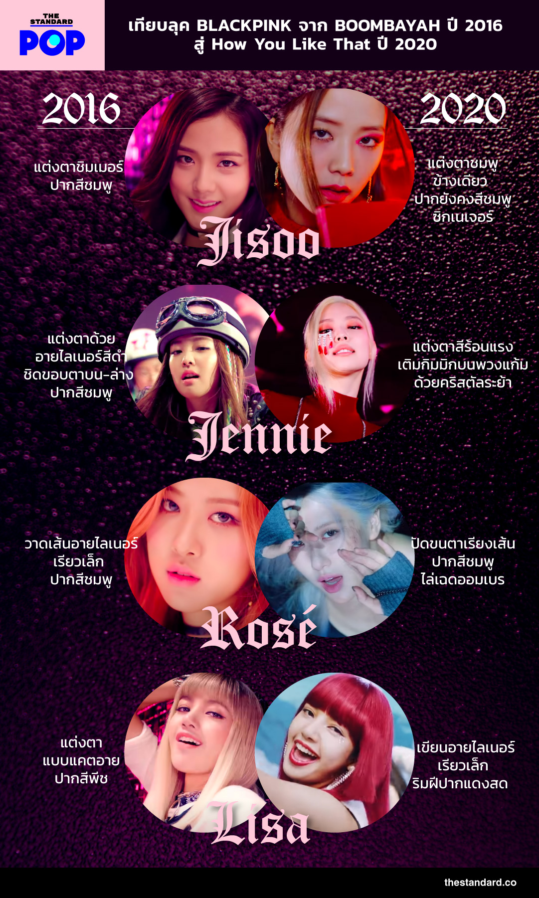 หลังจากที่เพลง How You Like That เปิดตัวให้แฟนทั่วโลกได้ชมพร้อมกันไปเมื่อวานนี้ ยอดวิวและยอดคอมเมนต์ของเหล่า BLINK ก็พุ่งทะยานควบคู่ไปพร้อมกัน หนึ่งในสิ่งที่เราอยากชวนโฟกัสคือ ลุคความงามที่เติบโตขึ้นของทั้ง 4 สาว วันนี้ THE STANDARD POP จึงพาทุกคนไปเทียบลุคจาก BOOMBAYAH สู่ลุคล่าสุด How You Like That ที่กำลังเป็น Talk of the Town อยู่ในขณะนี้