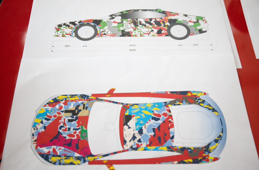 “ที่เลือก BMW i8 เพราะมันเข้ากับสไตล์เราที่สุด ในแง่ของตัวงานและคาแรกเตอร์ของ BMW i8 มันเท่อยู่แล้ว และด้วยฟอร์มของรถทำให้เราสามารถดีไซน์มันอย่างไรก็ได้ เลย Decode Pattern ใหม่ เลือกจากแพตเทิร์นที่ชอบ แล้วถอดเป็นเลเยอร์ ดูอันที่อยู่ในคอนโพสต์เดียวกันได้ สังเกตว่าสีสันต่างๆ เราเปลี่ยนใหม่หมด จะไม่เห็นสีเขียวลายพรางบนชิ้นงานนี้เลย เลือกใช้สีแดง สีฟ้า รูปทรงเรขาคณิต เดิมทีลายทหารมันอาจจะเรียบๆ พอเราใส่ฟอร์มลงไป เช่น ลายเฉียง จึงดึงคาแรกเตอร์ของแต่ละลายออกมาได้ชัดขึ้น จนกลายเป็น Fusion Camouflage