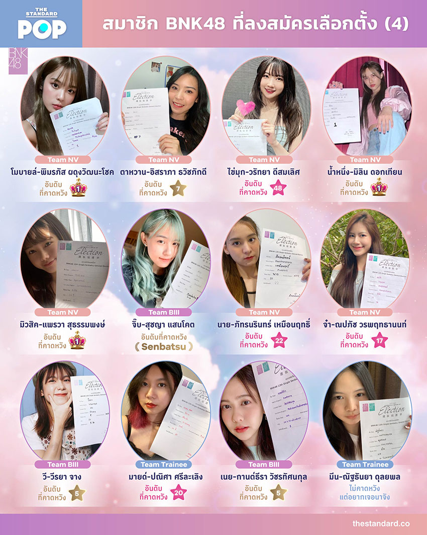 หลังวงไอดอลกรุ๊ป BNK48 เริ่มเปิดให้สมาชิกวงส่งใบสมัครร่วมงาน 12th Single Senbatsu General Election หรืองานเลือกตั้งครั้งที่ 3 ตั้งแต่วันที่ 11-24 มกราคมที่ผ่านมา ตอนนี้แฟนๆ ก็ได้เห็นรายชื่อของสมาชิกที่จะเข้าร่วมงานทั้ง 62 คนเป็นที่เรียบร้อย THE STANDARD POP ถือโอกาสรวบรวมรายชื่อสมาชิก BNK48 และ CGM48 ที่ลงสมัครและไม่ลงสมัครงานเลือกตั้งครั้งที่ 3 ให้แฟนๆ ได้ย้อนชมกันอีกครั้ง เพื่อเตรียมความพร้อม (และเงินในกระเป๋า) ก่อนร่วมส่งพวกเธอไปให้ถึงอันดับที่คาดหวัง