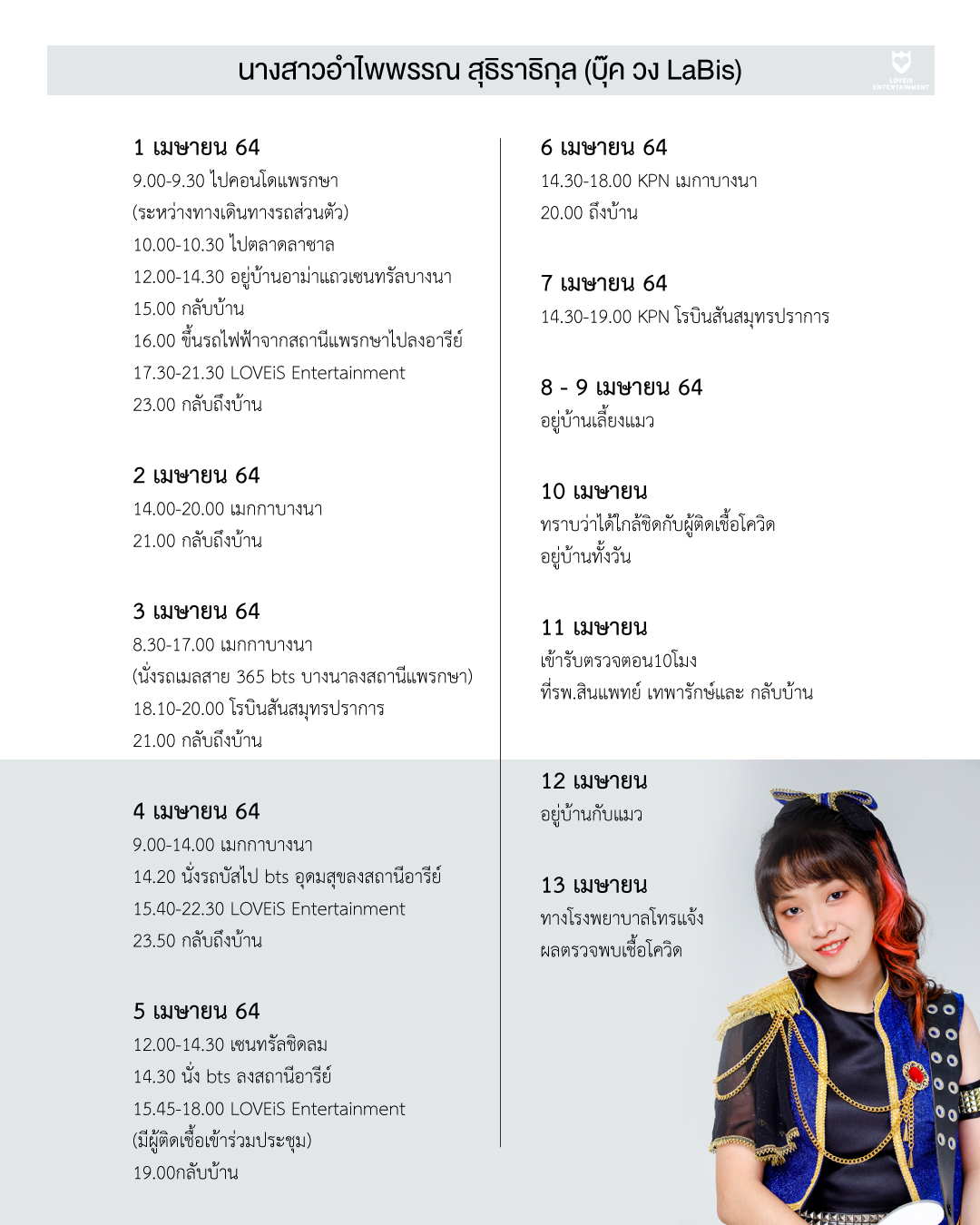 บ่ายวันนี้ (13 เมษายน) ค่าย LOVEiS Entertainment ได้ออกมาอัปเดตสถานการณ์โควิด-19 ของศิลปินภายใต้สังกัดอีกครั้ง โดย บุ๊ค-อำไพพรรณ สุธิราธิกุล มือเบสวง LaBis ได้ทราบผลการตรวจโควิด-19 พบว่า ‘ติดเชื้อ’ หลังจากใกล้ชิดกับผู้ติดเชื้อในการประชุมของบริษัทฯ ในวันที่ 5 เมษายนที่ผ่านมา พร้อมเผยไทม์ไลน์การเดินทางในช่วงวันที่ 1-13 เมษายน
