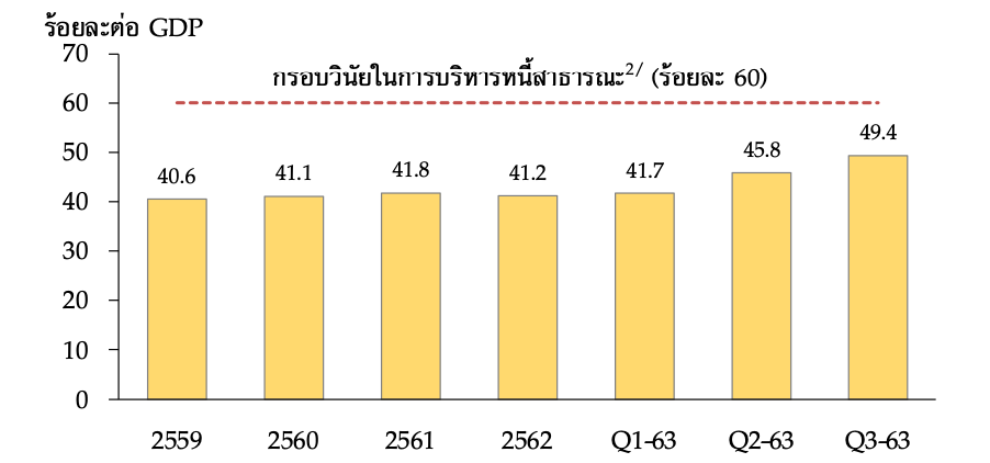 โดยระดับหนี้สาธารณะต่อ GDP ปรับเพิ่มขึ้นมาอยู่ที่ 49.4% ณ สิ้นไตรมาส 3/63 จาก 41.2% ณ สิ้นปี 2562 และมีแนวโน้มเข้าใกล้กรอบวินัยทางการคลังที่ 60% ในช่วง 2 ปีข้างหน้า แต่หากมีความจำเป็น รัฐบาลสามารถก่อหนี้เพื่อกระตุ้นเศรษฐกิจเพิ่มเติมได้ เนื่องจากอัตราดอกเบี้ยต่ำช่วยลดต้นทุนการกู้ยืมของรัฐบาล รวมถึงระดับหนี้สาธารณะของไทยยังอยู่ระดับไม่สูงเมื่อเทียบกับประเทศอื่น