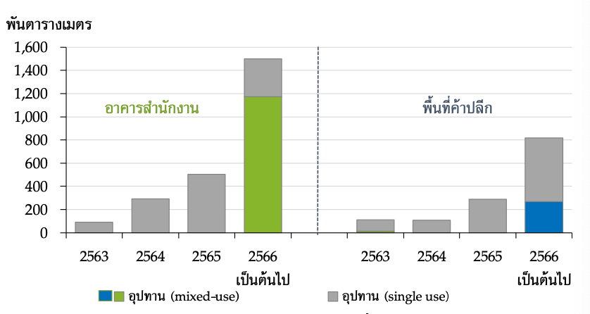 สำหรับภาคอสังหาริมทรัพย์ยังมีความเสี่ยงจากอุปทานคงค้างที่มีแนวโน้มเพิ่มขึ้นเนื่องจากพฤติกรรมผู้บริโภคที่เปลี่ยนไป โดยอุปทานของตลาดอาคารสำนักงานและตลาดพื้นที่ค้าปลีกมีแนวโน้มเพิ่มขึ้นมากตั้งแต่ปี 2566 เป็นต้นไป ส่วนหนึ่งเป็นผลจากการเปิดโครงการอสังหาริมทรัพย์แบบผสม (มิกซ์ยูส) ที่เร่งตัวขึ้น