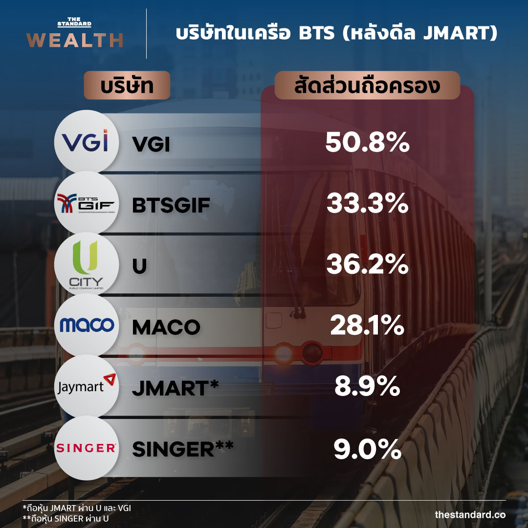 อย่าง บมจ.วีจีไอ (VGI) ถือได้ว่าเป็นหัวหอกสำคัญของ BTS ในฐานะผู้ให้บริการสื่อโฆษณาบนรถไฟฟ้าและบริเวณสถานี และยังได้ขยายการลงทุนไปยังสื่อโฆษณาประเภทอื่นๆ ผ่านการลงทุนในบริษัทอย่าง บมจ.มาสเตอร์ แอด (MACO) ด้วยเช่นกัน ปัจจุบัน BTS ถือหุ้นใน VGI รวมๆ กันอยู่ราว 50% และถือหุ้นใน MACO อีกเกือบ 28% ตามสัดส่วนการถือหุ้น