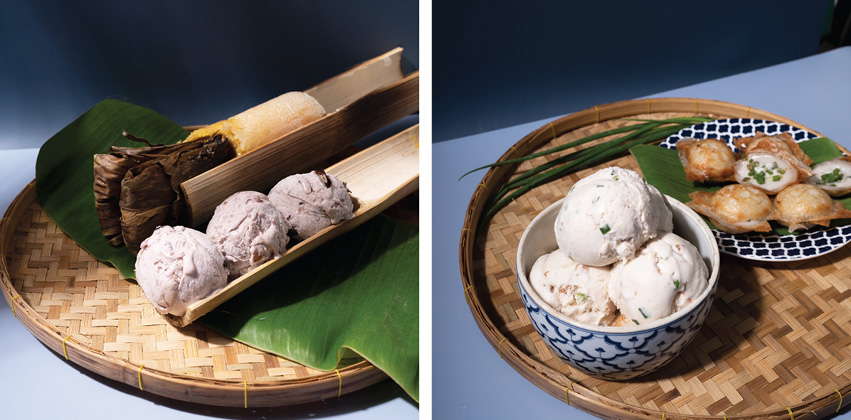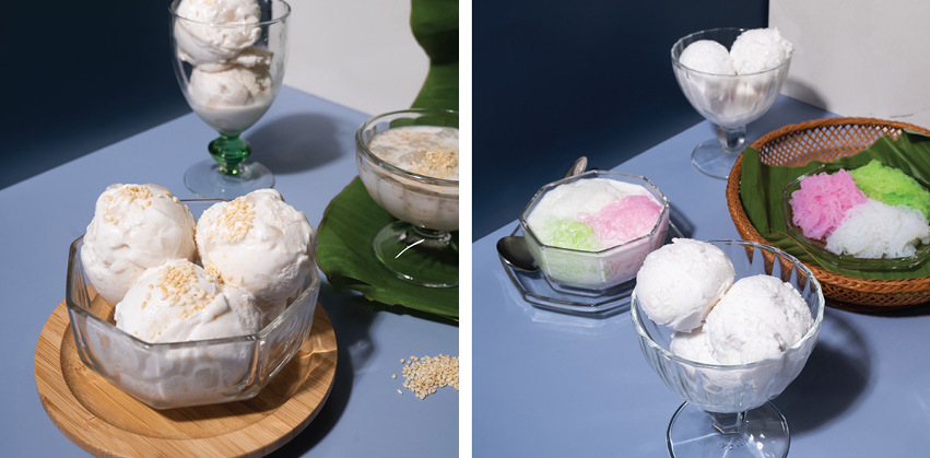 ไอศกรีมชุดคำไทยมีทั้งหมด 4 รสชาติจากขนมไทยยอดฮิตที่ใครๆ ก็ต้องเคยกิน ไม่ว่าจะเป็น ‘ไอศกรีมข้าวหลามถั่วดำ’ เข้มข้นด้วยกะทิหอมมัน เพิ่มความสนุกด้วยเม็ดถั่วดำและเนื้อข้าวเหนียวดำให้เคี้ยวเพลินยิ่งขึ้น ครบรสหวานมันเค็มเหมือนกินข้าวหลามสูตรโบราณอย่างแท้จริง ‘ไอศครีมครองแครงกะทิสด’ ที่ยกเอาสัมผัสและรสชาติของขนมไทยหนึบหนับเคี้ยวเพลินหอมกะทิมาทำเป็นไอศกรีมหวานเย็นชื่นใจ เข้มข้นด้วยรสชาติของกะทิสดเข้มข้นและงาขาวคั่วสดใหม่ ผสมเนื้อครองแครงสูตรพิเศษที่คงความเหนียวนุ่มแม้อยู่ในไอศกรีม ‘ไอศกรีมขนมครก’ ขนมไทยที่ใครๆ ก็คุ้นเคยกันดี ในรูปแบบไอศกรีมเย็นๆ ที่รักษารสชาติขนมครกสูตรต้นตำรับไว้ได้ดีเยี่ยม หอมกะทิและกลิ่นแป้งกรุบกรอบ โรยด้วยต้นหอมซอย เหมือนได้กินขนมครกแคะใหม่ๆ จากเตา รสสุดท้ายคือ ‘ไอศกรีมซ่าหริ่มกะทิอบควันเทียน’ เส้นซ่าหริ่มสีสันสดใสจากส่วนผสมธรรมชาติ หอมกลิ่นกะทิคั้นสดที่นำไปอบควันเทียนไว้หนึ่งคืนตามสูตรดั้งเดิม