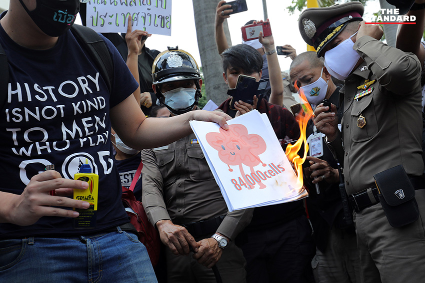 วันนี้ (24 กรกฎาคม) กลุ่มนวชีวิน ร่วมกับภาคีนักศึกษาศาลายา รวมตัวทำกิจกรรมบริเวณหน้าทำเนียบรัฐบาล ภายใต้กิจกรรมชื่อ Burn in Hell ‘84,000 Cells’ โดยกลุ่มภาคีนักศึกษาศาลายาได้อ่านแถลงการณ์ข้อเรียกร้อง 5 ข้อคือ
