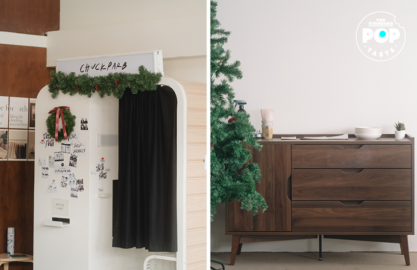 ในร้านจะมีตู้ถ่ายรูปที่ดีไซน์เข้ากับร้านวางอยู่ โดยในทุกเทศกาลจะมีเทมเพลตกรอบรูปใหม่ๆ ให้เลือกอยู่เสมอ โดยคุณสามารถเข้าไปถ่ายรูปได้ในราคาใบละ 100 บาท