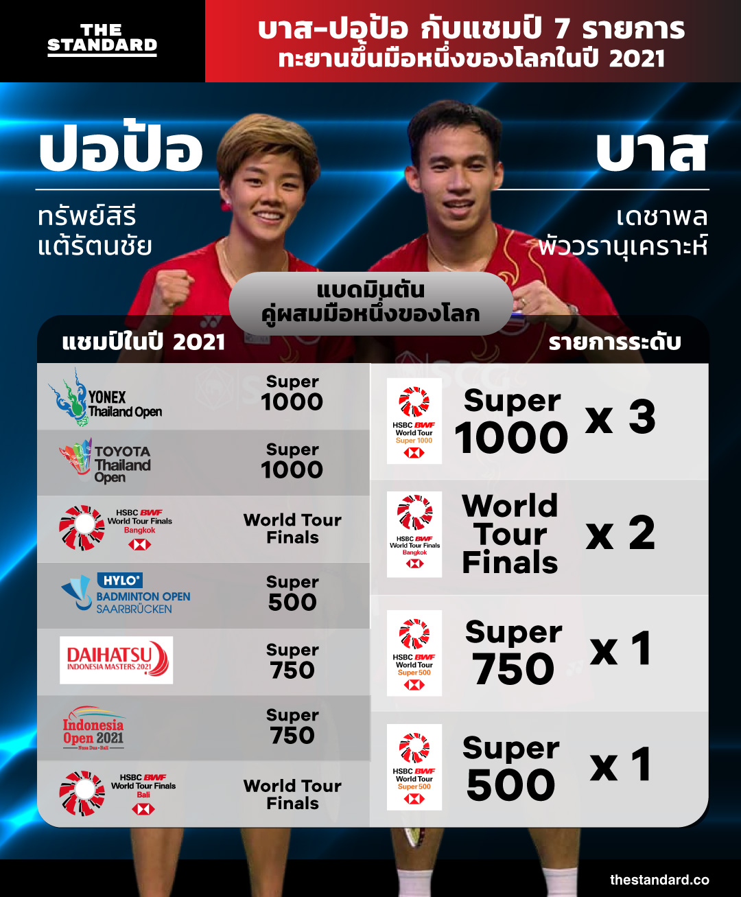 โดยในปี 2021 ที่ผ่านมานับเป็นช่วงเวลาแห่งความสำเร็จของคู่ผสมของไทย ที่เริ่มต้นปีในอันดับที่ 2 ของโลก และไล่ล่าคว้าแชมป์รายการใหญ่อย่างต่อเนื่อง จนสุดท้ายทั้งคู่สามารถก้าวขึ้นมือหนึ่งของโลกได้สำเร็จ