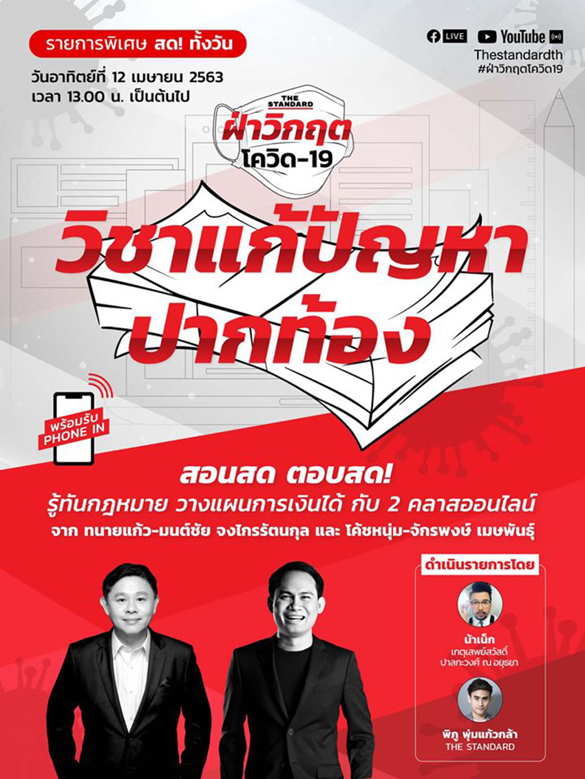 What: คลาสออนไลน์เต็มรูปแบบในรายการ THE STANDARD ฝ่าวิกฤตโควิด-19: วิชาแก้ปัญหาปากท้อง ชวนเติมความรู้ด้านกฎหมายและการเงินแบบเข้าใจง่าย ใช้ได้จริง พร้อมเปิดรับสายไขข้อข้องใจสดๆ จาก ทนายแก้ว-มนต์ชัย จงไกรรัตนกุล เจ้าของเพจ Legal Intelligence มนต์ชัย ทนายโซเชียล และ โค้ชหนุ่ม-จักรพงษ์ เมษพันธุ์ The Money Coach