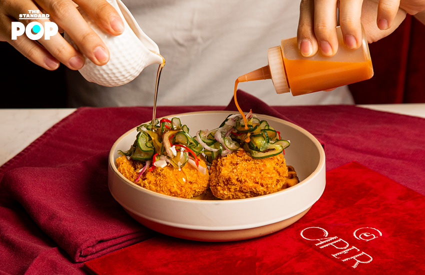 ผ่านวาฟเฟิลไปสองจาน จนมาจานที่สาม แม้จะดูหน้าตาคุ้นๆ ตามประสาวาฟเฟิลกับไก่ทอดแบบที่เคยเห็นกันทั่วไป แต่ทว่ารสชาติไม่ธรรมดา Crispy Fried Chicken Waffle (390 บาท) จับคู่คาว-หวานระหว่างไก่ทอดกับวาฟเฟิล โดยมีเมเปิ้ลไซรัปกับฮอตซอสเป็นตัวประสานรสชาติ ลองราดซอสทีละชนิดแล้วชิมดูก่อน สำหรับเรา ราดซอสทั้งคู่แล้วกินพร้อมกันเลย อย่าลืมกินแตงกวาสลอว์ที่มาคู่กันด้วยล่ะ