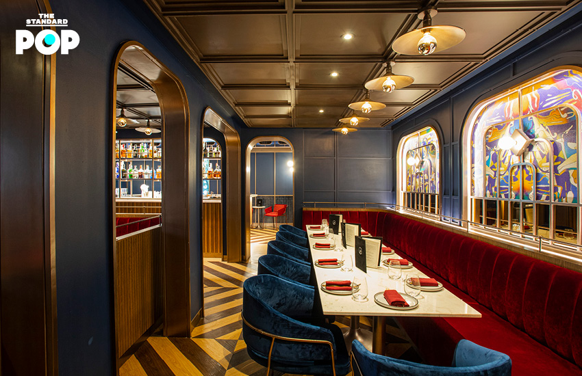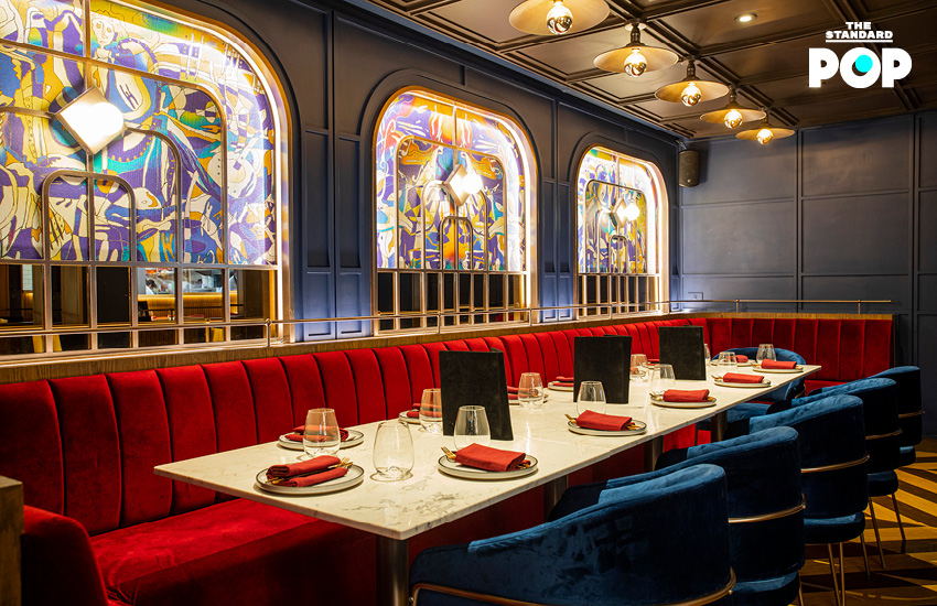 โทนร้านเน้นสีแดงและน้ำเงินเป็นหลัก ตัดด้วยสีทองและสีธรรมชาติของไม้ ให้บรรยากาศกึ่งย้อนยุคและมีความแคชวลเป็นกันเอง