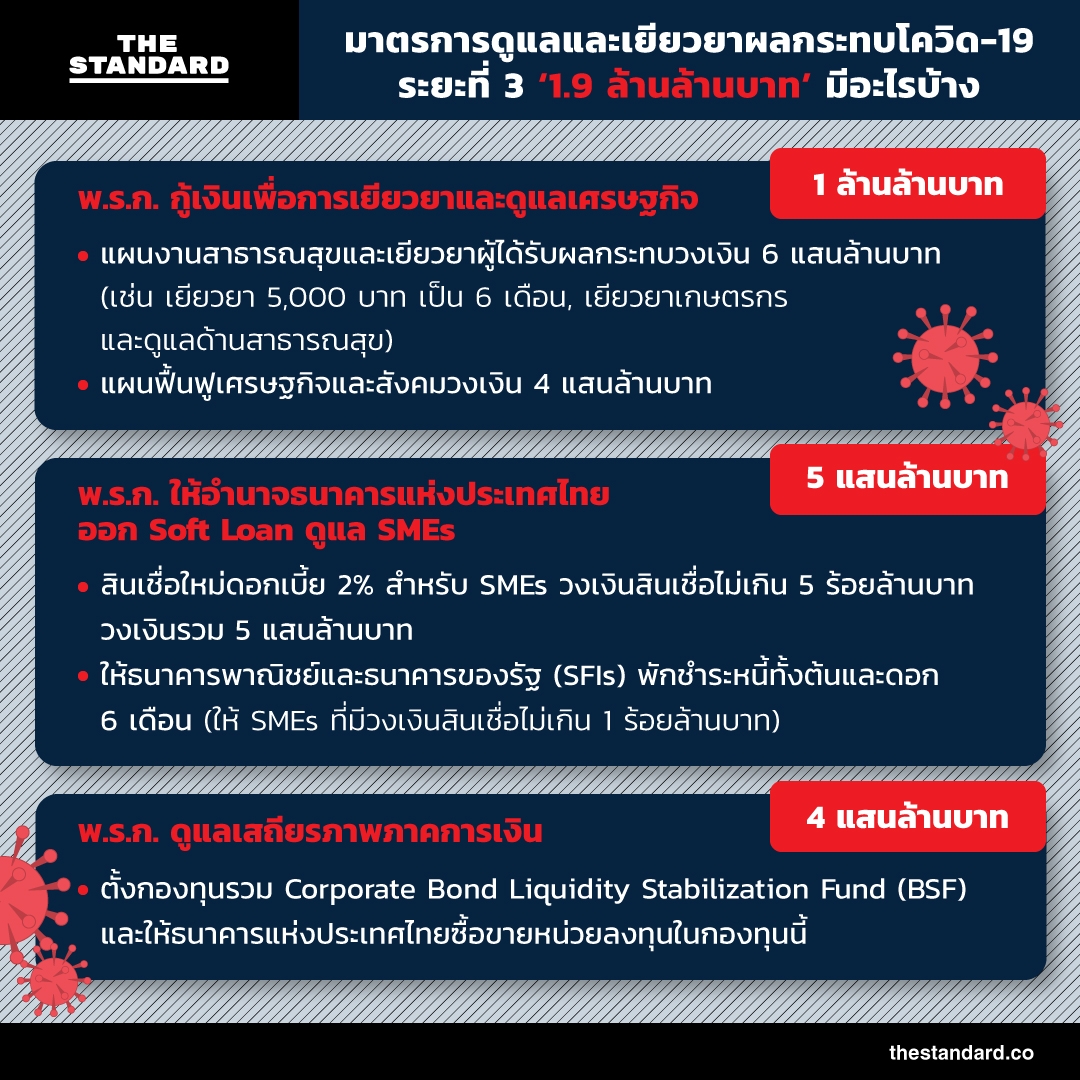 คณะรัฐมนตรี (ครม.) มีมติออกมาตรการดูแลและเยียวยาผู้ได้รับผลกระทบจากโควิด-19 ระยะที่ 3 แล้ว ซึ่งต้องใช้วงเงินสูงถึง 1.9 ล้านล้านบาท หรือคิดเป็น 1 ใน 3 ของงบประมาณประจำปี 2563