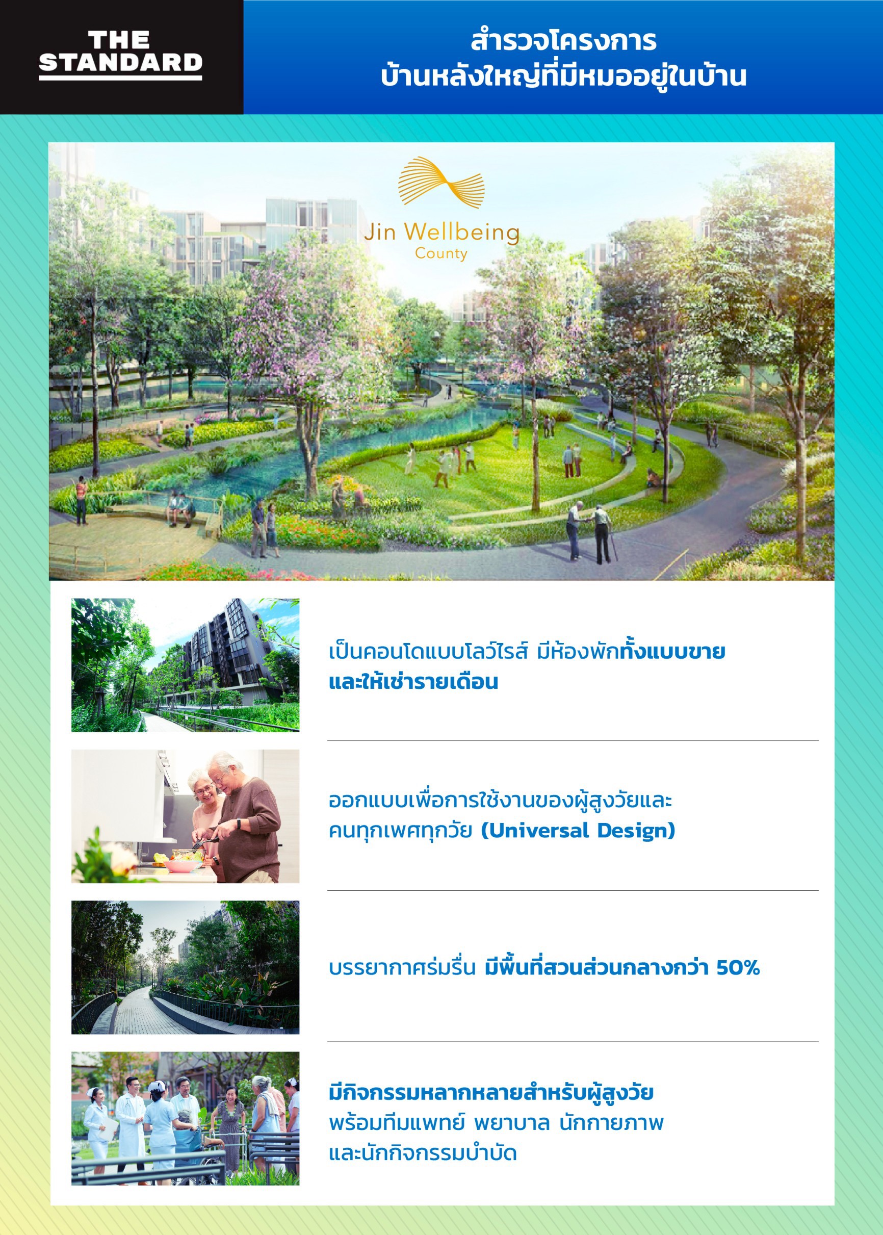 จึงเป็นที่มาของโครงการ ‘จิณณ์ เวลบีอิ้ง เคาน์ตี้’ ริมถนนพหลโยธิน โดยใช้ระยะเวลาเดินทางเพียง 15 นาที จากสนามบินนานาชาติดอนเมือง ที่สามารถใช้ชีวิตในโครงการและสังคมที่ออกแบบมาเพื่อรองรับผู้สูงวัยและมีบริการทางการแพทย์รองรับ