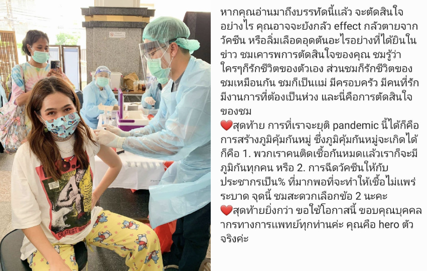 ท้ายที่สุดการตัดสินใจฉีดวัคซีนหรือไม่ก็ขึ้นอยู่กับการตัดสินใจของแต่ละคน อยากให้คนดังเป็นแค่ตัวกลางส่งผ่านข้อมูลที่เป็นประโยชน์ในการตัดสินใจ แต่ไม่อยากให้เชื่อว่าสิ่งที่เขาใช้ สิ่งที่เขาเลือกนั้นดีไปเสียหมด สำหรับผู้เขียนเองเคยคิดว่าจะรอวัคซีนทางเลือก แต่ตอนนี้เปลี่ยนใจอยากได้วัคซีนให้เร็วที่สุด ไม่ใช่เพราะเป็นวัคซีนที่ดีที่สุด แต่อยากให้สถานการณ์ปกติเร็วๆ เพื่อเช็กบิลคนที่ตัดสินใจผิดๆ ให้กับเรา