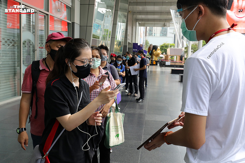 ศูนย์การค้าเซ็นทรัลเวิลด์ ถือเป็นอีกจุดหนึ่งที่โดยปกติแล้ว จะมีประชาชนรวมตัวมาใช้บริการต่างๆ ในห้างอยู่เป็นจำนวนมาก หลังการปิดเพราะสถานการณ์โรคโควิด-19 วันนี้ก็กลับมาพร้อมให้บริการ โดยมีประชาชาชน รวมถึงเจ้าหน้าที่ พนักงานในโซนต่างๆ ของศูนย์การค้ามารอคิวเข้าไปด้านในตั้งแต่ก่อนเวลาเปิด ซึ่งเมื่อได้เวลาทำการ ทุกคนจะต้องผ่านด่านคัดกรอง ด้วยการสแกนคิวอาร์โค้ดก่อนเข้าไปด้านใน ผ่าน ‘ไทยชนะ’ ซึ่งเป็นเสมือนการเช็กอินสถานที่ และเมื่อกลับก็ต้องเช็กเอาต์ว่าออกจากสถานที่นั้นแล้ว โดยในช่วงเช็กอิน ระบบจะขอหมายเลขโทรศัพท์เพื่อเก็บเป็นข้อมูล รวมทั้งต้องผ่านการวัดอุณหภูมิ ล้างมือด้วยเจล เมื่อเข้ามาแล้วต้องรักษาระยะห่างในการใช้บริการร้านต่างๆ โดยจะมีเจ้าหน้าที่คอยอำนวยความสะดวก ชี้แจงตามจุด มีการติดตั้งเครื่องทำความสะอาดบันไดเลื่อน ให้ขึ้นบันไดเลื่อนห่างคนละสองขั้น รวมถึงมีหุ่นยนต์ที่นำมาใช้เตือนให้รักษาระยะห่าง