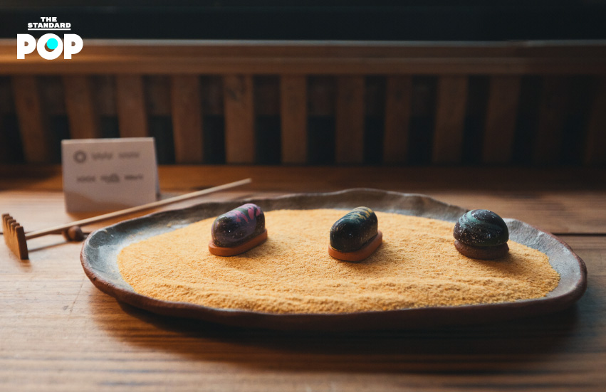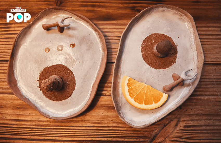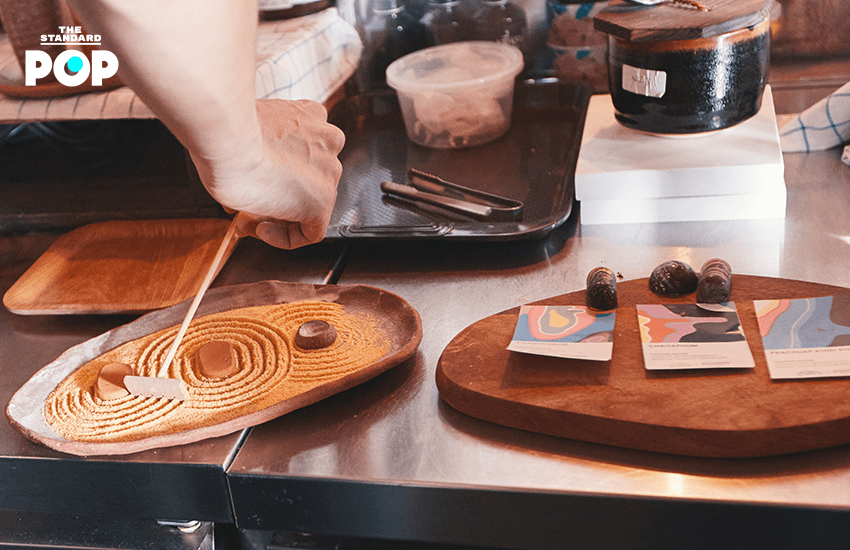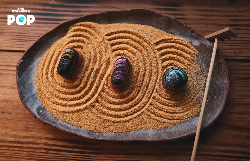 แต่ไฮไลต์ก็ยังไม่หมดเท่านั้น เพราะเมื่อมาที่นี่คุณก็สามารถได้รับประสบการณ์ Cacao Ceremony ฉบับมินิกัน ได้กับเมนูที่ชื่อว่า ‘Sweet Meditation’ เซ็ตที่ประกอบไปด้วย Chocolate Bon Bon รสชาติต่างๆ ที่จะสับเปลี่ยนไปเรื่อย (ตามภาพคือ มันเผา กล้วย และเลมอนฮันนี่) เสิร์ฟมาในถาดทรายพร้อมไม้ให้เราใช้เวลาวาดลวดลายต่างๆ ลงไป