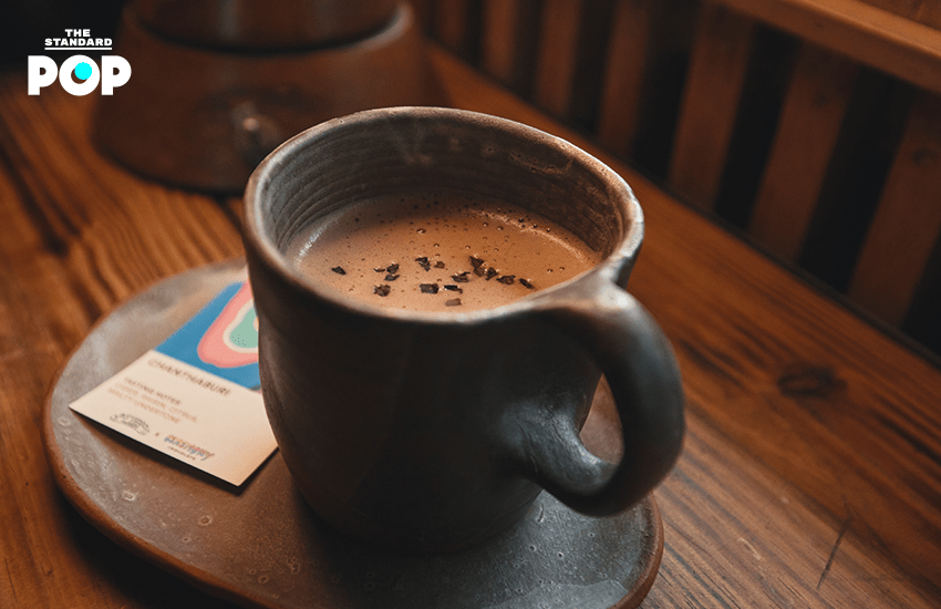 เราชอบความฟรุตตี้ของช็อกโกแลตจันทบุรี จึงลองสั่งแบบร้อน (140 บาท) ส่วนชัยภูมิที่มีความกลมๆ ใกล้เคียงกับช็อกโกแลตที่เราคุ้นเคยทั่วไป ลองสั่งเป็นแบบเย็น (140 บาท) ก็เข้มข้นชื่นใจ เพราะเมนูเย็นของที่นี่ใช้วิธีคนกับน้ำแข็งจนเย็น และเสิร์ฟแบบไม่ใส่น้ำแข็ง ไม่เจือจางแน่นอน หรือจะลองแบบผสมกาแฟ ที่นี่เลือกช็อกโกแลตจากประจวบฯ ผสมกับกาแฟจากเชียงราย สั่งได้ทั้งร้อนและเย็น (150 บาท) ทุกเมนูเสิร์ฟในแก้วเซรามิกจากศิลปินที่ขอนแก่นที่คุณเบนสั่งปั่นพิเศษสำหรับโปรเจกต์นี้โดยเฉพาะ
