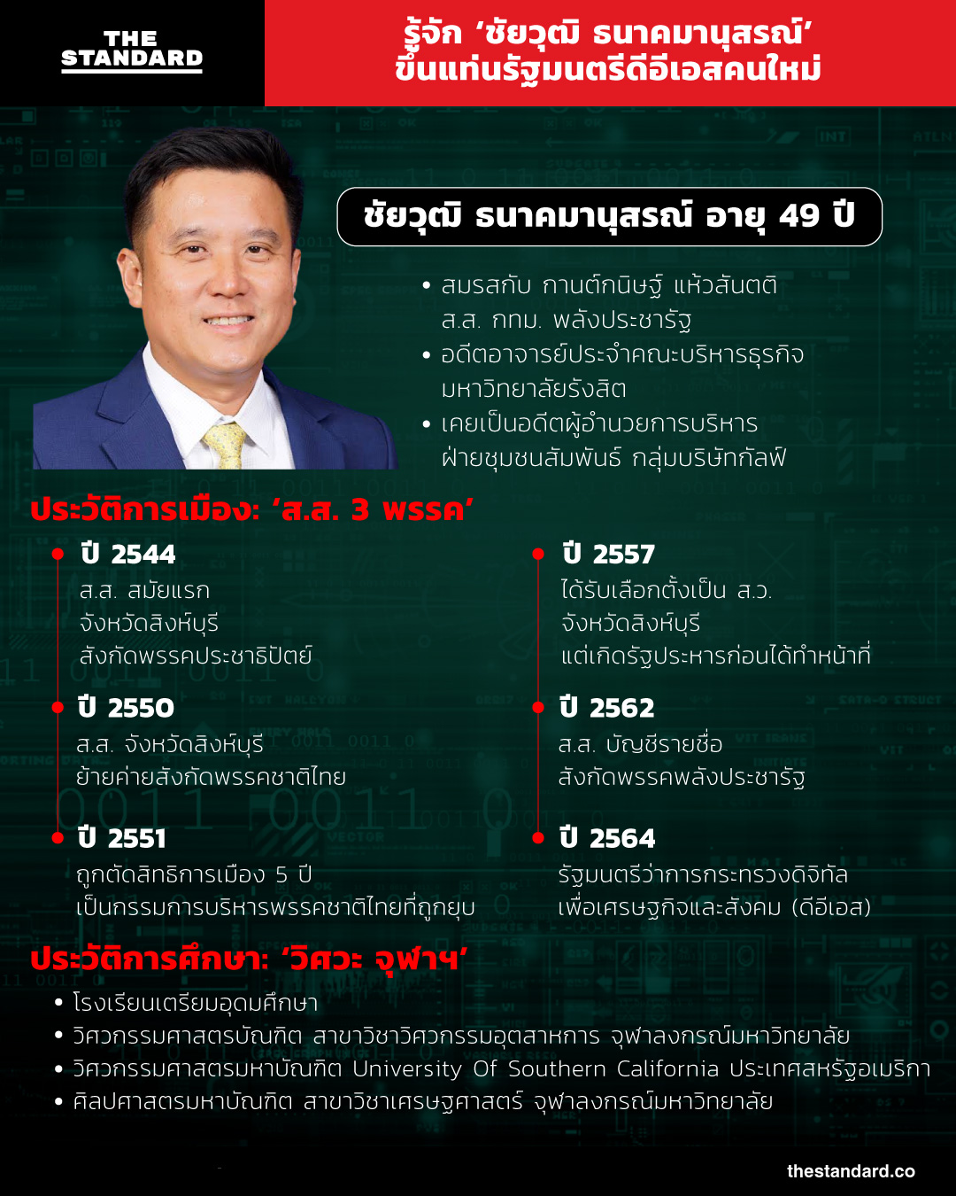 วานนี้ (23 มีนาคม) ราชกิจจานุเบกษา เผยแพร่พระบรมราชโองการโปรดเกล้าฯ ประกาศแต่งตั้งรัฐมนตรีใหม่ หนึ่งในนั้นคือ ‘ชัยวุฒิ ธนาคมนุสรณ์’ ส.ส. พลังประชารัฐ ขึ้นแท่นเป็นรัฐมนตรีว่าการกระทรวงดิจิทัลเพื่อเศรษฐกิจและสังคม (ดีอีเอส) คนใหม่ แทน พุทธิพงษ์ ปุณณกันต์ ที่ถูกศาลพิพากษาจำคุก