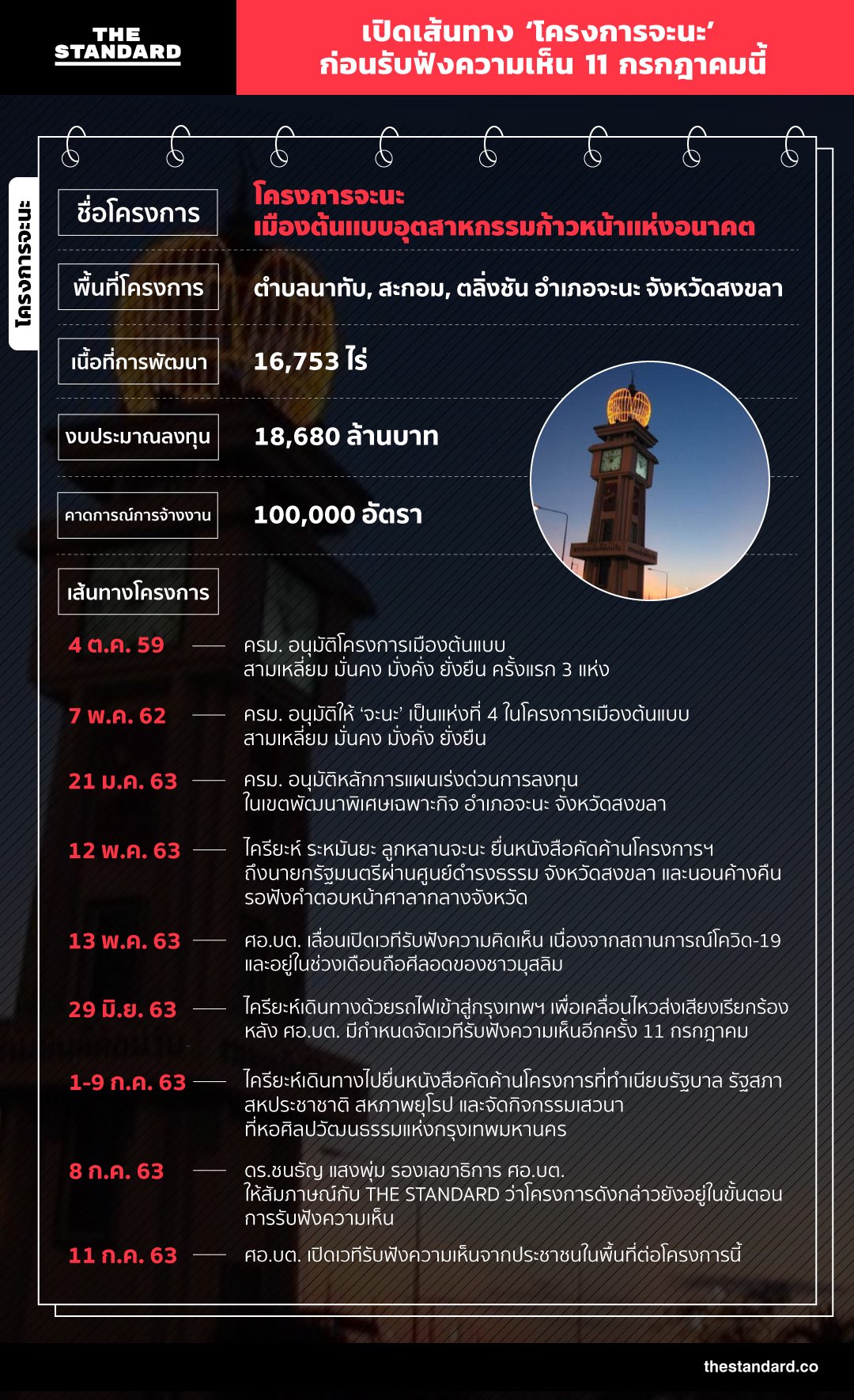 ‘โครงการจะนะ เมืองต้นแบบอุตสาหกรรมก้าวหน้าแห่งอนาคต’ ที่คณะรัฐมนตรีได้อนุมัติให้เป็นแห่งที่ 4 ภายใต้โครงการเมืองต้นแบบสามเหลี่ยม มั่นคง มั่งคั่ง ยั่งยืน ซึ่งจะยกสถานะ ‘จะนะ’ ให้กลายเป็นเมืองต้นแบบอุตสาหกรรม เพื่อสร้างงานและยกระดับคุณภาพชีวิตของประชาชนทั้งในพื้นที่ พื้นที่รอบข้าง พร้อมเชื่อมโยงเศรษฐกิจกับประเทศเพื่อนบ้าน