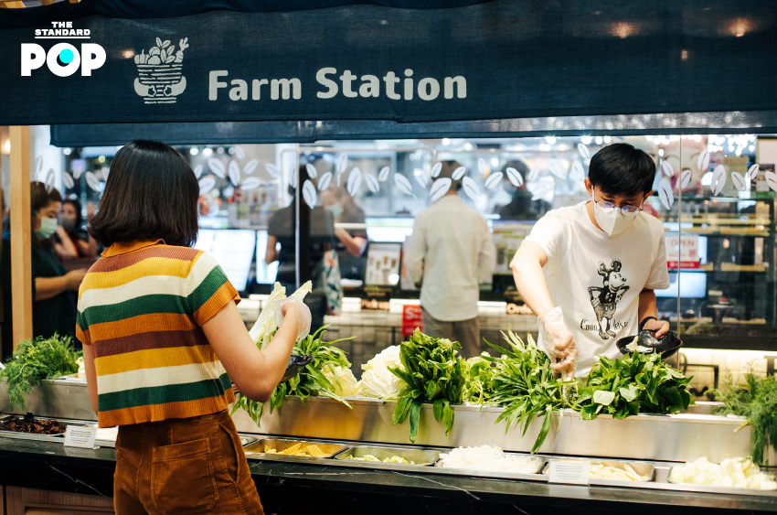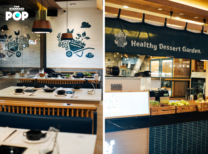 บริเวณหน้าร้านจะมีซุ้มขายเครื่องดื่มที่คุณสามารถเดินเข้ามาซื้อน้ำผักผลไม้สกัดเย็นหรือน้ำผักผลไม้ปั่นได้ ส่วนภายในร้านเลือกใช้องค์ประกอบที่ทำให้รู้สึกเหมือนนั่งอยู่ในบ้าน อย่างการเลือกใช้บานเกล็ด ช่องลม ขื่อบ้าน หรือแม้แต่ตู้กับข้าวมาประดับตกแต่งในร้าน ทำให้สว่างด้วยแสงธรรมชาติ ส่วนไฮไลต์สำคัญของร้านคือ Farm Station บาร์ผักที่มีผักเติมตลอดเหมือนยกฟาร์มมาให้ถึงที่ ไม่ว่าจะเป็นผักพื้นฐานของชาบูอย่างผักกาดขาว ผักบุ้ง กะหล่ำปลี เห็ดนานาชนิด ไปจนถึงผักหลากสีอย่างแครอต ฟักทอง เผือก ให้คุณได้สนุกไปกับการจัดจานผักของตัวเอง และผสมน้ำจิ้มเองให้ได้รสชาติที่ชื่นชอบ
