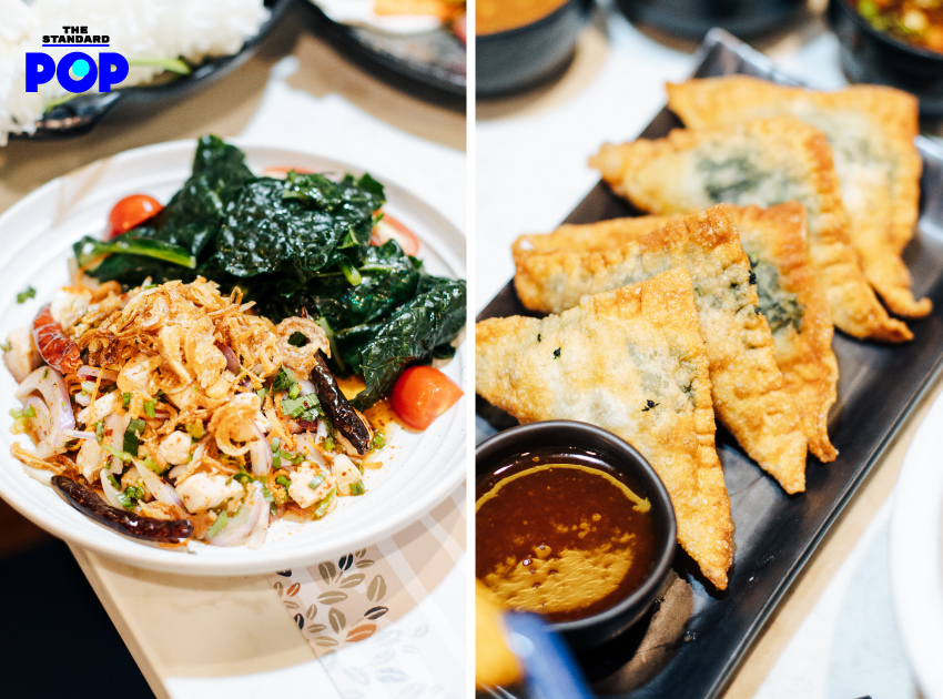 สลัดลาบไก่ผักเคลไดโนเสาร์ (155 บาท) และเกี๊ยวทอดผักโขมอบชีส (95 บาท)