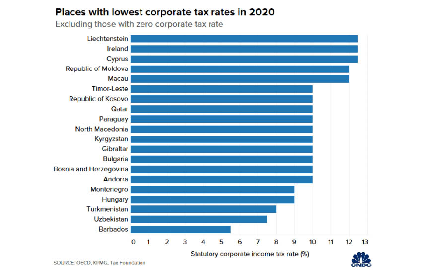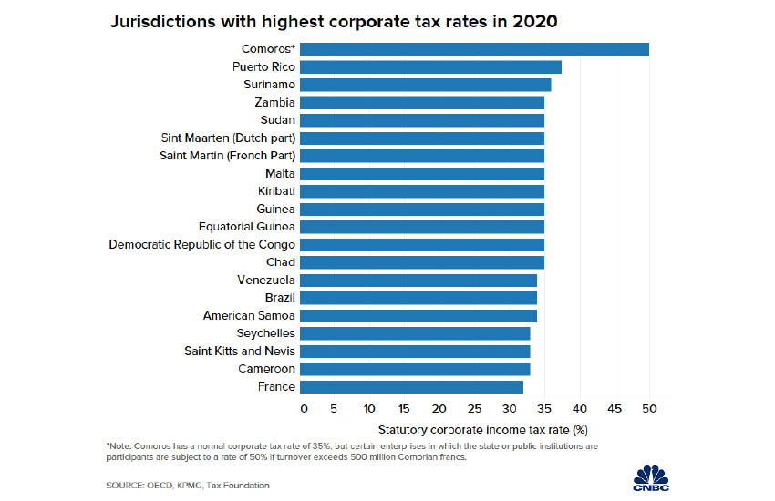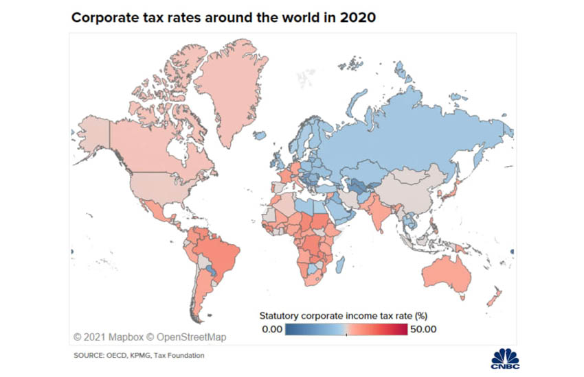 สำนักข่าว CNBC ได้สำรวจกลุ่มประเทศที่เรียกเก็บภาษีนิติบุคคลสูงที่สุดและต่ำที่สุดในโลก โดยอ้างอิงข้อมูลจาก Tax Foundation, OECD และบริษัทด้านที่ปรึกษา KPMG พบว่า ปัจจุบันกลุ่มประเทศในแถบแอฟริกาและอเมริกาใต้เรียกเก็บภาษีธุรกิจสูงกว่ากลุ่มประเทศในแถบยุโรปและเอเชีย ขณะที่กลุ่มประเทศขนาดเล็ก เช่น บัลแกเรีย และลิกเตนสไตน์ มักเรียกเก็บภาษีในอัตราต่ำ
