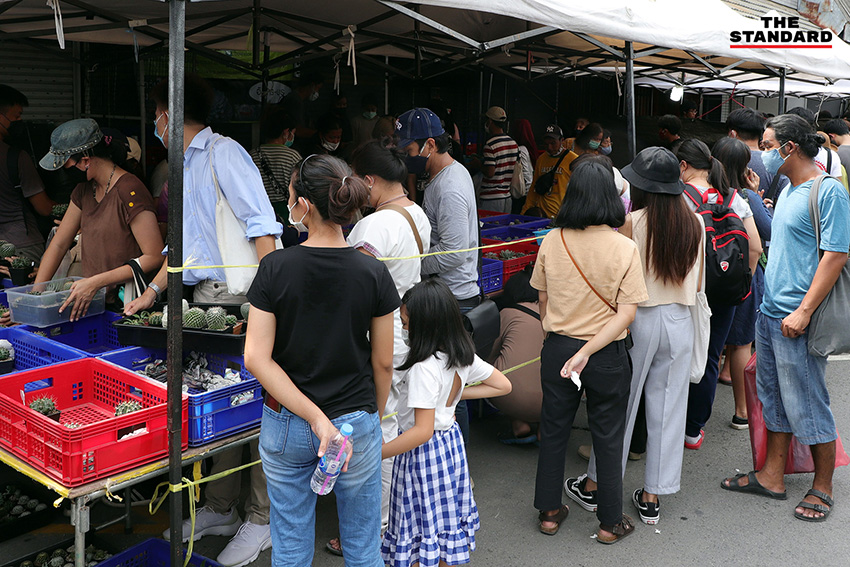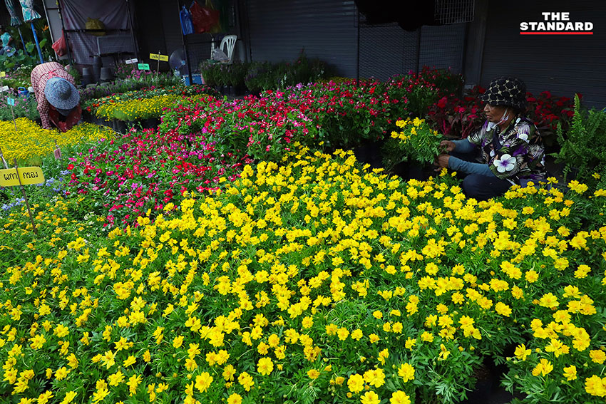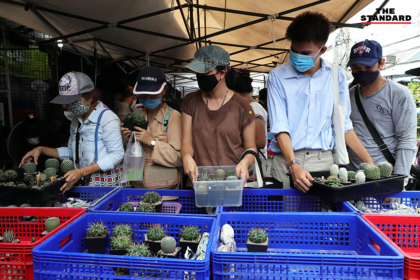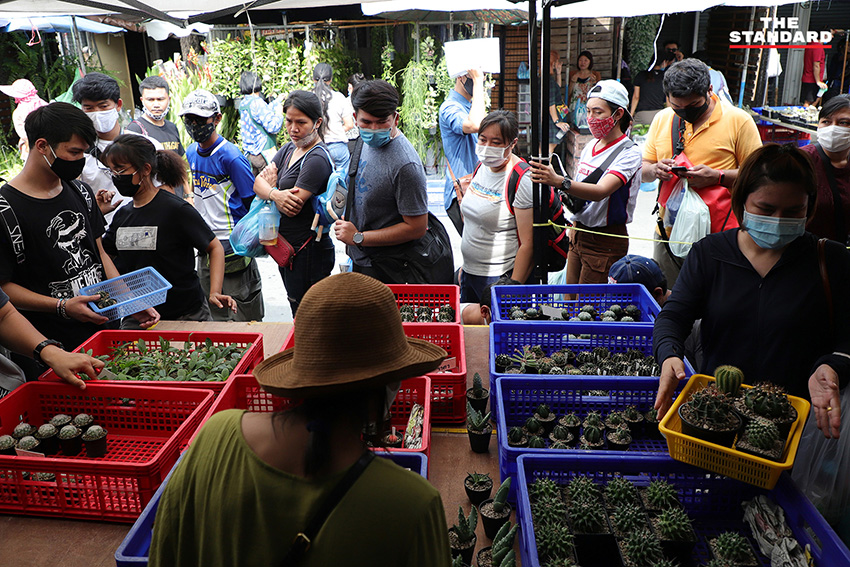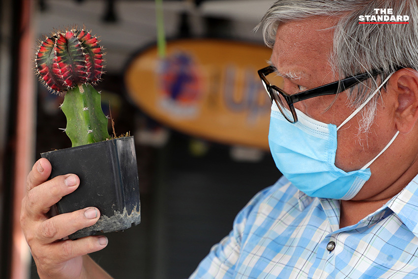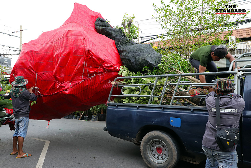 THE STANDARD ลงพื้นที่สำรวจตลาดต้นไม้ในยามบ่ายที่อากาศค่อนข้างร้อนจัด แต่ผู้คนที่มาเดินหาซื้อต้นไม้ก็ยังคงหนาแน่น ทั้งซื้อไปปลูกและดูแลเอง หรือบางรายก็เป็นพ่อค้า-แม่ค้าที่ซื้อแล้วเอาไปขายต่อ ซึ่งบางรายก็มาจากต่างจังหวัด ซื้อต้นไม้ขนขึ้นกระบะนำไปขายต่อก็มี ด้วยตลาดต้นไม้ที่คึกคักอย่างนี้ ทำให้ราคาต้นไม้ปรับตัวเพิ่มสูงขึ้นอย่างต่อเนื่องในช่วงที่ผ่านมา