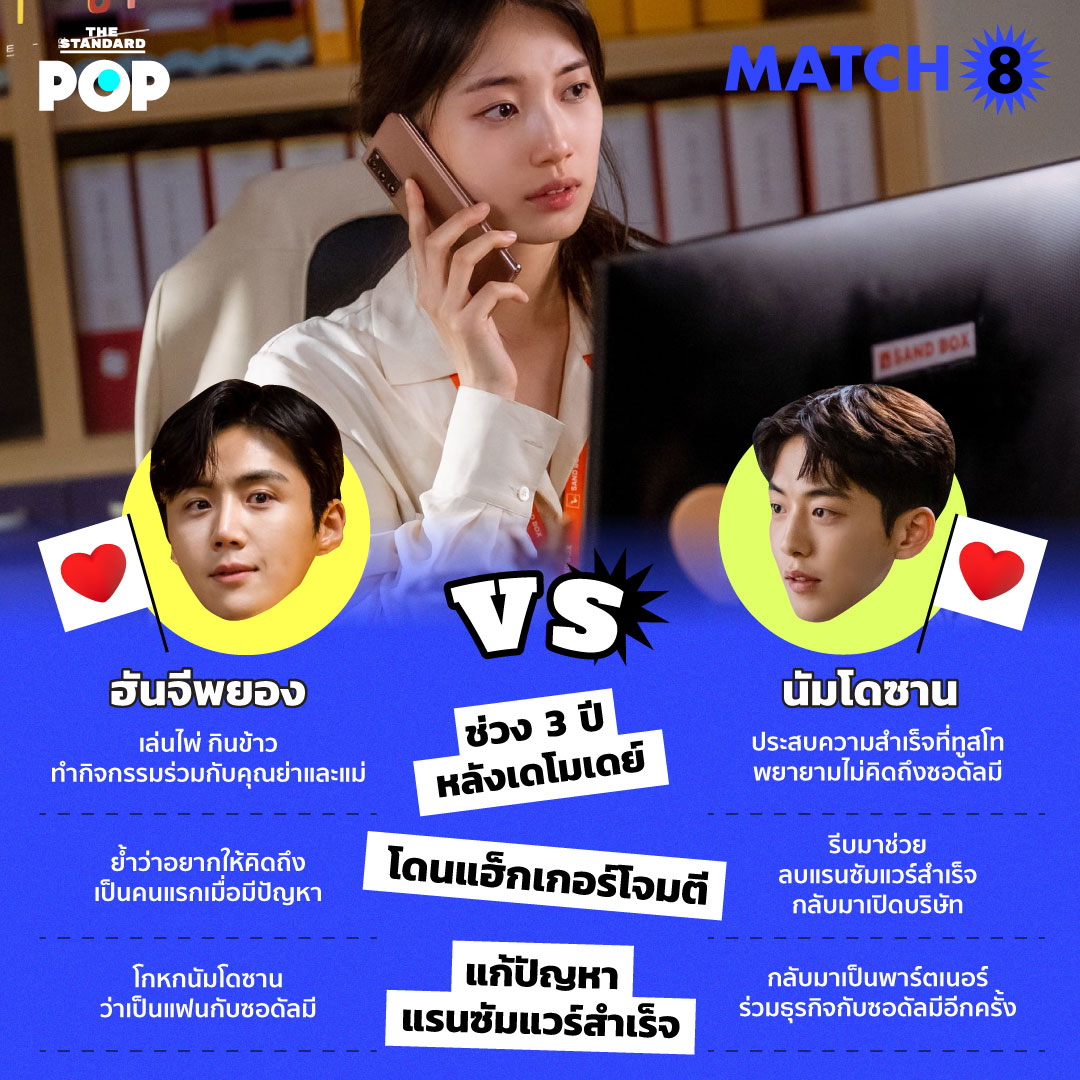 ถึงแม้เส้นเรื่องในซีรีส์จะเปิดทางจนเแทบไม่ต้องลุ้นแล้วว่าใครคือพระเอกของเรื่อง แต่ THE STANDARD POP ก็ยังขอเก็บประเด็นทำเช็กลิสต์คะแนน ‘ความสัมพันธ์’ สิ่งที่ฮันจีพยองและนัมโดซานทำให้กับซอดัลมี (แบซูจี) ตั้งแต่ตอนแรกถึงตอนล่าสุด เพื่อให้คะแนน (แบบลำเอียงได้เต็มที่) กันอีกครั้ง ว่าสำหรับคุณแล้วใครกันแน่คือ ‘พระเอกตัวจริง’ ของซีรีส์เรื่องนี้