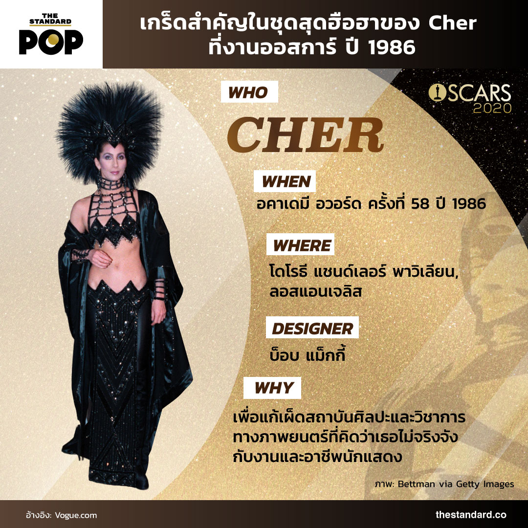 ในช่วงยุค 80 ไม่มีใครไม่พูดถึงสไตล์ของนักร้องหญิงและนักแสดงในตำนานอย่าง แชร์ (Cher) โดยเฉพาะในงานประกาศรางวัลออสการ์ ปี 1986 เมื่อเธอปรากฏตัวในชุดที่เรียกความสนใจจากสื่อและผู้คนเป็นอย่างมาก กับลุคบราสีดำปักเลื่อม กระโปรงเอวต่ำคลุมทับรองเท้าบู๊ตสีดำ พร้อมเสื้อคลุมผ้าแคชเมียร์ และที่สำคัญคือเครื่องประดับศีรษะทรงโมฮอว์กที่ทำมาจากขนนกสุดอลังการ