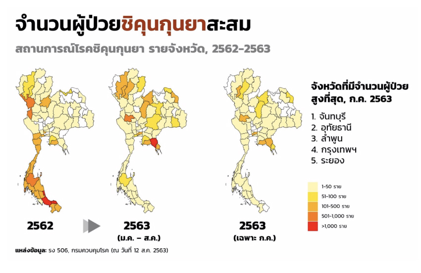 ตั้งแต่ต้นปี 2563 ประเทศไทยมีจำนวนผู้ป่วยสะสมเกือบ 6 พันราย (ข้อมูล ณ วันที่ 12 สิงหาคม 2563) โดยในเดือนกรกฎาคมที่ผ่านมา จังหวัดที่มีรายงานจำนวนผู้ป่วยมากที่สุด 3 อันดับแรก ได้แก่ จันทบุรี อุทัยธานี และลำพูน เท่ากับว่ามีพื้นที่ยังระบาดอยู่เกือบทั่วประเทศ ยกเว้นภาคใต้ที่ระบาดหนักไปแล้วเมื่อปีที่ผ่านมา