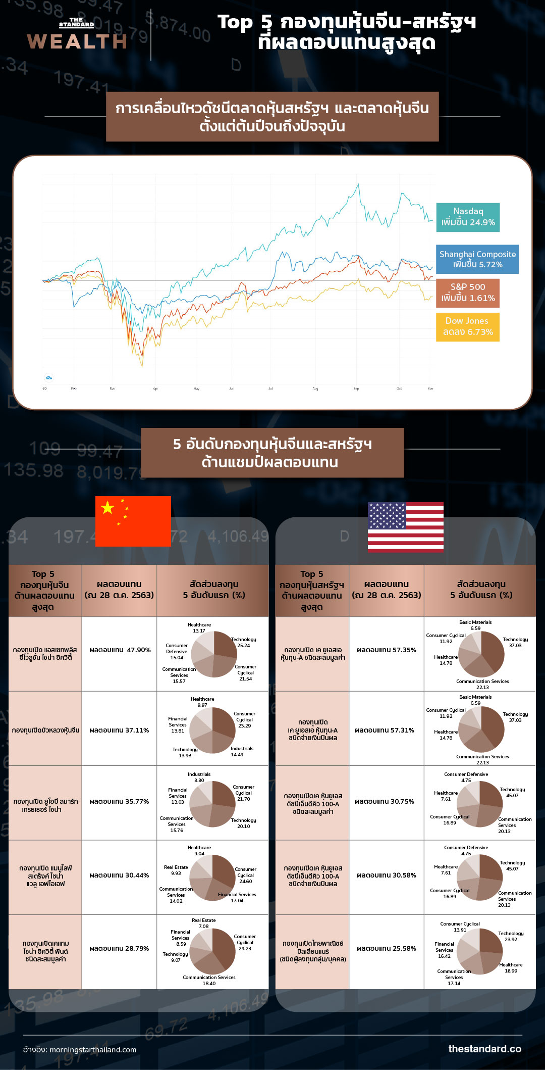 ท่ามกลางความผันผวนของตลาดหุ้นทั่วโลกและหลายแห่งก็ติดลบ ‘กองทุนหุ้นจีน-สหรัฐฯ’ ขึ้นแท่นรูปแบบการลงทุนที่สปอตไลต์ส่อง ดักอานิสงส์เลือกตั้งสหรัฐฯ สำรวจ Top 5 พบให้ผลตอบแทนสูงถึง 30-50%YTD