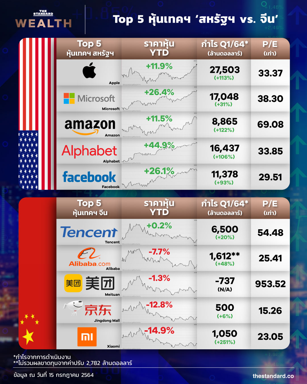 หุ้นกลุ่มเทคโนโลยีของสหรัฐฯ และจีนในช่วงไตรมาส 1/64 ที่ผ่านมา ส่วนใหญ่ยังคงมีกำไรเติบโตขึ้นมาได้ โดยเฉพาะฝั่งสหรัฐฯ ที่หลายบริษัทกำไรโตขึ้นเท่าตัวจากปีก่อน ส่วนฝั่งจีนในบริษัทอย่าง Alibaba กำไรจากการดำเนินงานจริงๆ ยังเป็นบวก แต่ไตรมาสล่าสุดก็โดนค่าปรับจากรัฐบาลจีนไปถึง 2.7 พันล้านดอลลาร์
