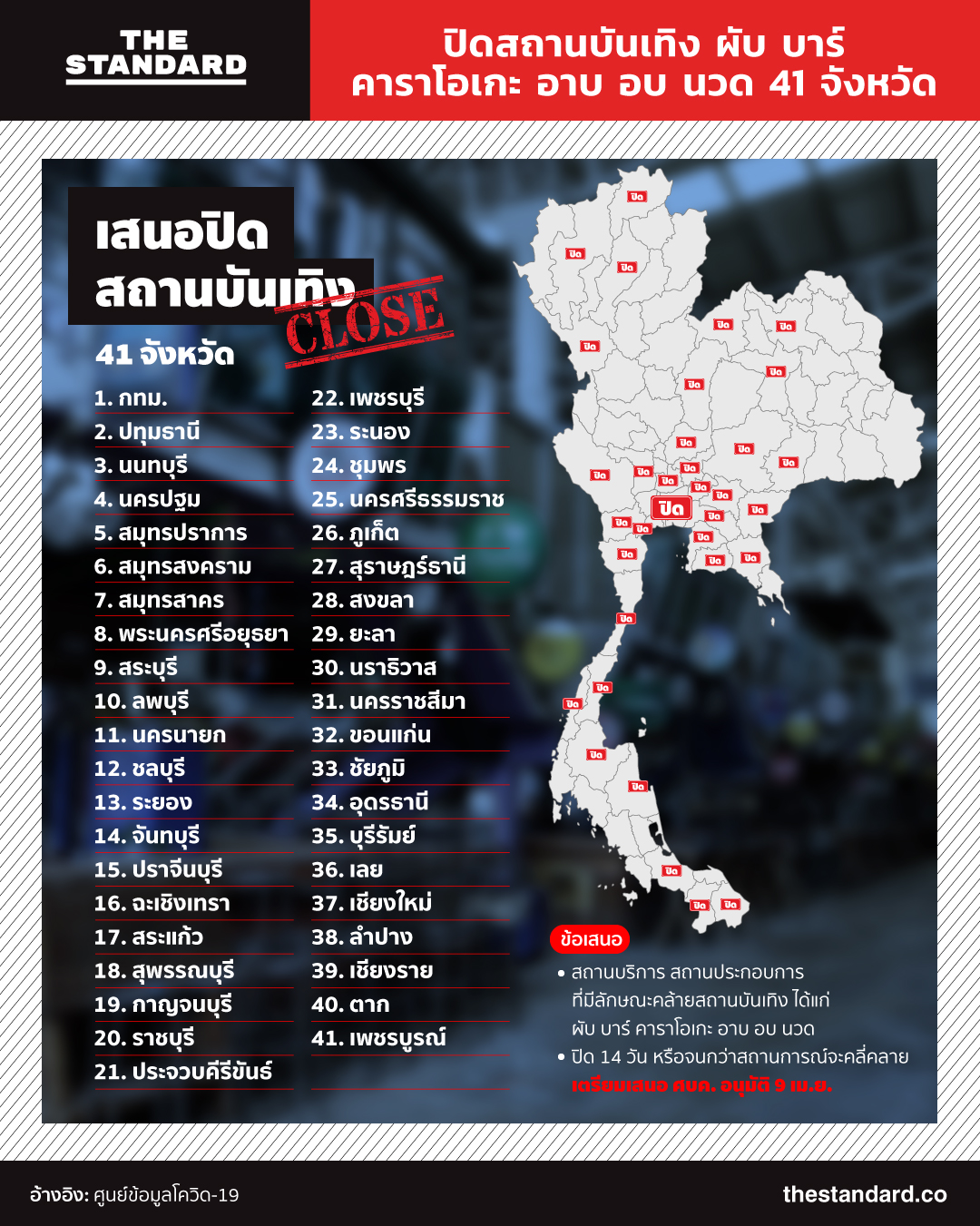 ล่าสุดวันนี้ (9 เมษายน) ที่ประชุม ศบค. มีมติให้คณะกรรมการโรคติดต่อจังหวัดหรือกรุงเทพมหานคร มีอำนาจในการสั่งปิดสถานบริการ, สถานประกอบการที่มีลักษณะคล้ายสถานบริการ, สถานบันเทิง, ผับ, บาร์, คาราโอเกะ, อาบอบนวด หรือสถานที่อื่นที่มีลักษณะคล้ายกัน ที่ตั้งอยู่ในเขตพื้นที่จังหวัดที่ได้ตรวจพบการระบาดและมีความเสี่ยงต่อการแพร่โรคที่จำเป็น ต้องดำเนินการในระยะเร่งด่วนจำนวน 41 จังหวัด ให้ปิดเป็นการชั่วคราวอย่างน้อย 14 วัน ตั้งแต่เที่ยงคืนวันนี้ (10 เมษายน)
