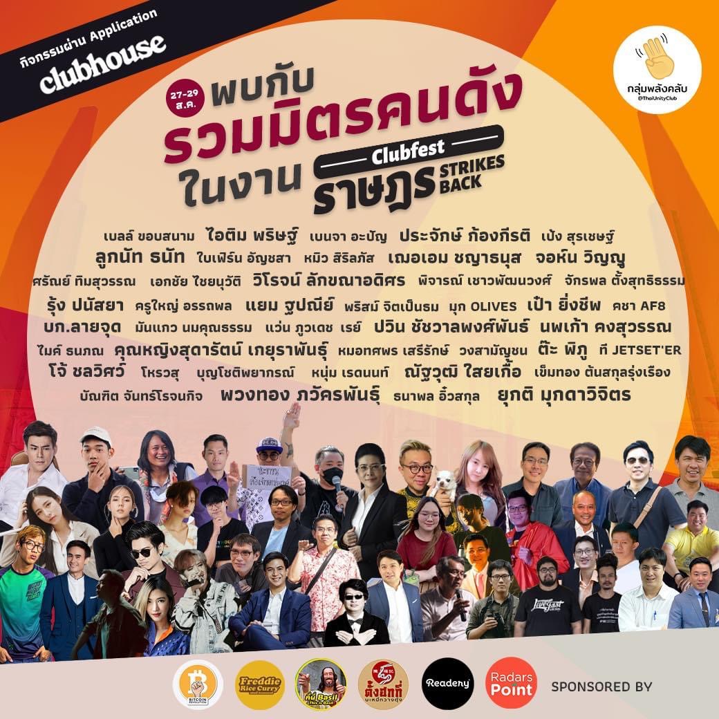 ซึ่งภายในงานจะรวบรวมประชาชนผู้มีความรู้และความสามารถจากทุกแขนง ไม่ว่าจะเป็นศิลปินที่จะมาร้องเพลงขับกล่อมผู้ฟัง, นักกิจกรรมด้านประชาธิปไตย รวมไปถึงนักแสดง คนดัง และนักวิชาการ ที่หลายคนคุ้นหน้าคุ้นตาตั้งแต่วันที่ Clubhouse เริ่มกลายเป็นหนึ่งใน ‘ป๊อปคัลเจอร์’ ที่มีพลังขึ้นมาในประเทศไทย