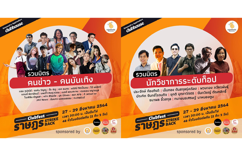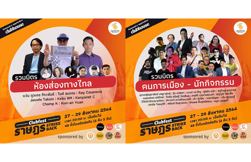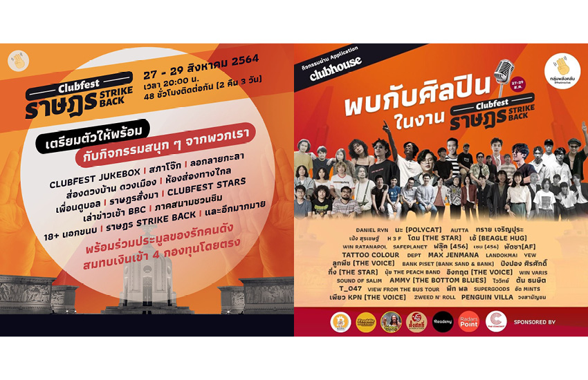 เตรียมตัวนับถอยหลังการรวมพลังแห่งความ ‘เดือด’ ที่ทั้งเข้มข้น สนุกสนาน มีสาระ และทุกคนมีโอกาสร่วมเป็นส่วนหนึ่งในการขับเคลื่อนสังคม กับงาน ClubFest 2021: ราษฎร Strike Back ที่กลุ่มพลังคลับ (ThaiUnityClub) จัดขึ้นเพื่อระดมทุนจากทุกภาคส่วนทั้งศิลปิน ดารา นักข่าว นักการเมือง สปีกเกอร์ อินฟลูเอนเซอร์ และผู้ฟัง ฯลฯ ที่จะผลัดเปลี่ยนหมุนเวียนกิจกรรมของ ‘ราษฎร’ มาทำกิจกรรม ‘เอาคืน’ อย่างสร้างสรรค์ รวมพลังผ่านแอปพลิเคชัน Clubhouse ติดต่อกัน 48 ชั่วโมงไม่มีพัก ในวันที่ 27-29 สิงหาคมนี้ ตั้งแต่เวลา 20.00 น. เป็นต้นไป