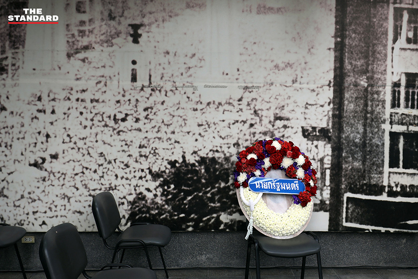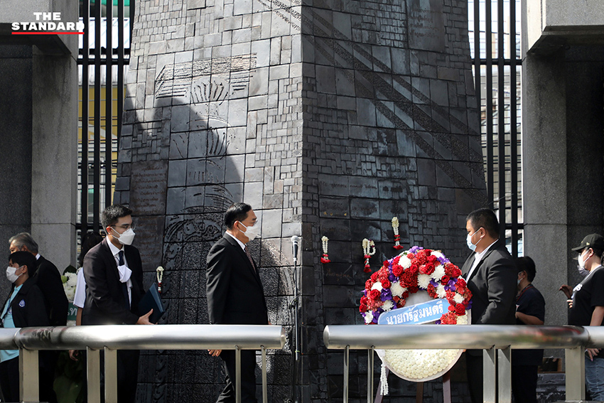จากนั้นเวลา 09.00 น. มีพิธีวางพวงมาลาและกล่าวรำลึกเหตุการณ์ 14 ตุลา 2516 โดยมี อนุชา นาคาศัย รัฐมนตรีประจำสํานักนายกรัฐมนตรี เป็นผู้แทนนายกรัฐมนตรี วางพวงมาลาและกล่าวสดุดี โดยระบุว่า เหตุการณ์ 14 ตุลา มีความสำคัญอย่างยิ่งต่อประวัติศาสตร์การเมืองไทย เป็นการยึดมั่นในระบอบประชาธิปไตยที่เป็นระบอบการปกครองที่ประชาชนมีอำนาจสูงสุด ในนามนายกรัฐมนตรีขอไว้อาลัยและขอสรรเสริญอุดมการณ์อันมั่นคงและวีรกรรมในเหตุการณ์วันนั้นย่อมเป็นภาพที่ชัดเจนอยู่ในจิตใจของประชาชน พร้อมขอให้ประชาชนร่วมกันสร้างสรรค์ประชาธิปไตยที่ดีงามต่อไป