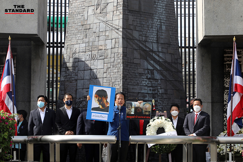 ขณะที่ นพ.ทศพร เสรีรักษ์ สมาชิกพรรคเพื่อไทย กล่าวสดุดีแทนผู้นำฝ่ายค้าน โดยระบุว่า จากวันนั้นถึงวันนี้เผด็จการยังคงอยู่ เพียงแต่เปลี่ยนรูปแบบไป ก่อนจะนำผู้ร่วมงานยืนสงบนิ่ง เพื่อรำลึกถึงผู้เสียชีวิตในเหตุการณ์ 14 ตุลา และเป่าเมาท์ออร์แกนเพลง เพื่อมวลชน เรียกร้องรัฐบาลให้หยุดทำร้ายประชาชน ก่อนจะให้ตะโกน “ปล่อยเพื่อนเรา”
