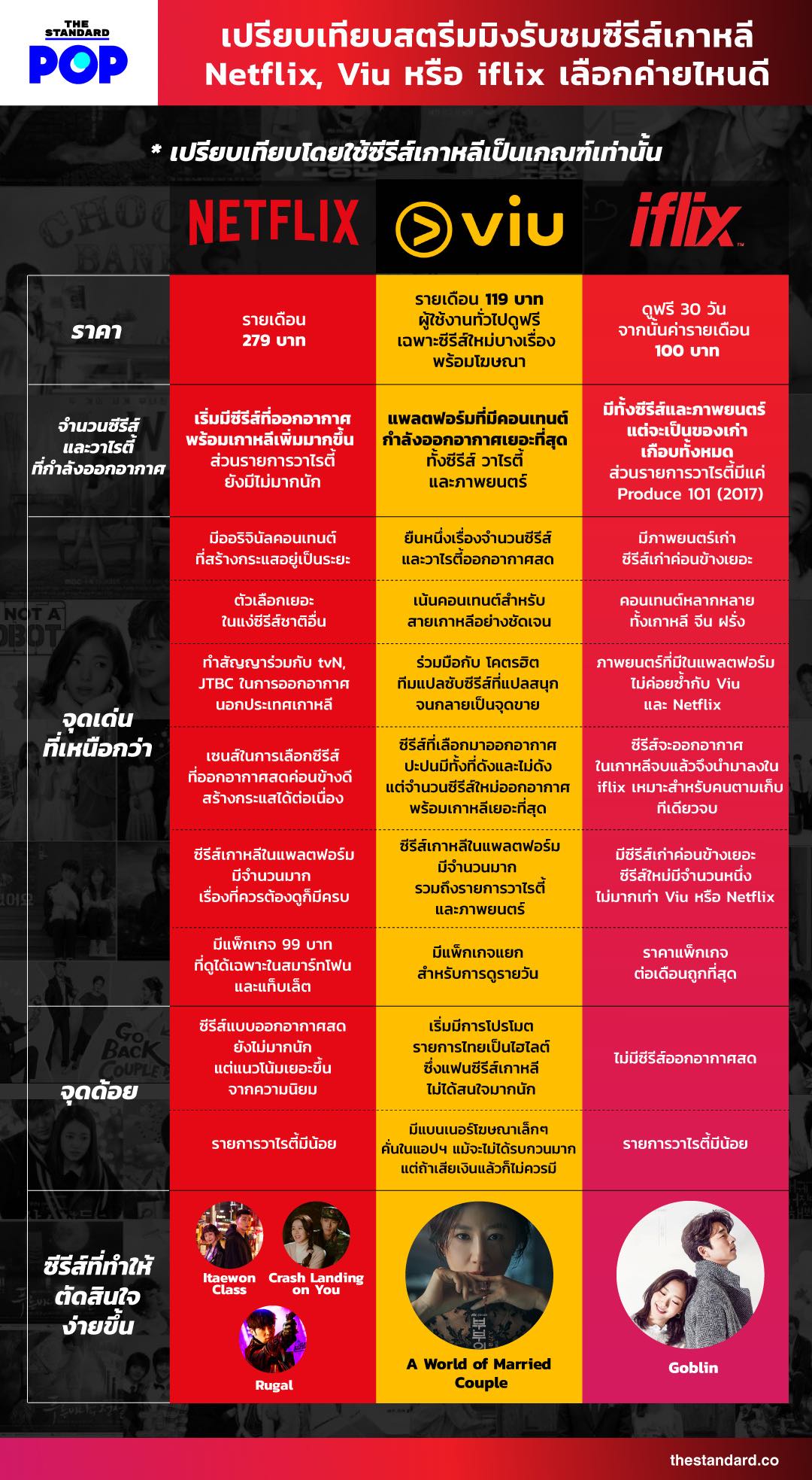 เราลองเปรียบเทียบสตรีมมิงการรับชมซีรีส์เกาหลี โดยคัดเลือกจากแพลตฟอร์มสำคัญๆ ในประเทศไทย ประกอบด้วย Netflix ที่หันมาเน้นซีรีส์เกาหลีอย่างเห็นได้ชัดในช่วงหลัง, Viu เจ้าแรกๆ ที่ซื้อลิขสิทธิ์ซีรีส์และรายการวาไรตี้มาฉาย และ iflix ที่มีคอนเทนต์เกาหลีแตกต่างออกไป กับจุดเด่นที่ราคาเข้าถึงได้ที่สุด