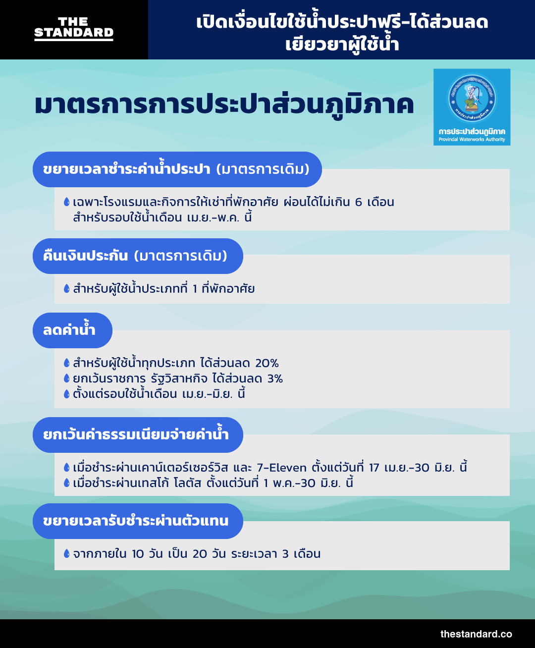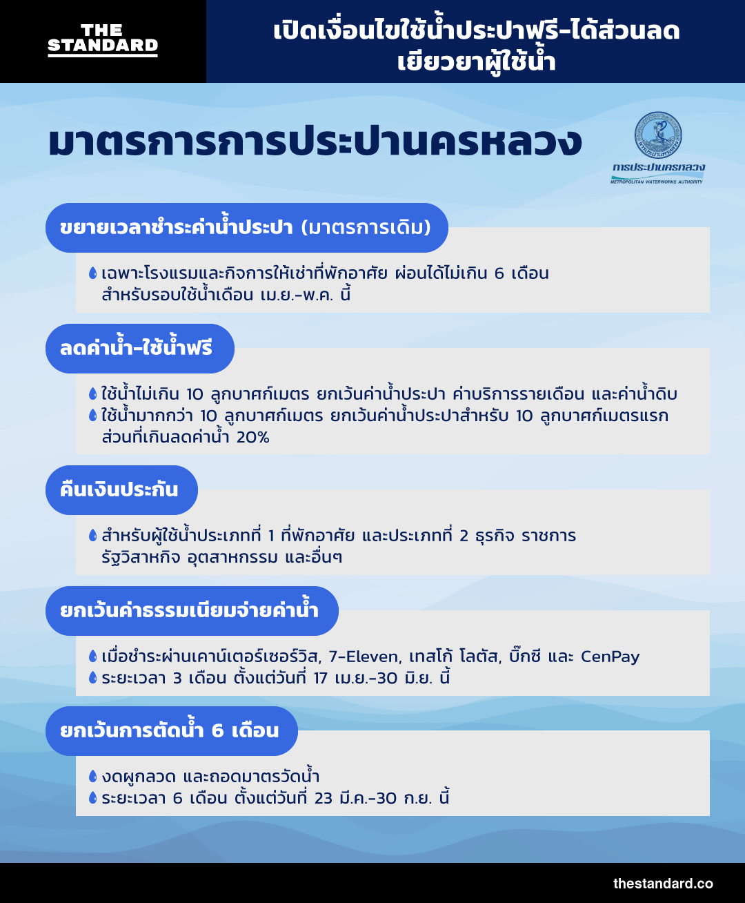- ยกเว้นการตัดน้ำประปาทั้งชั่วคราวและถาวร (งดผูกลวดและถอดมาตรน้ำ) เป็นเวลา 6 เดือน ตั้งแต่วันที่ 23 มี.ค.-30 ก.ย. นี้