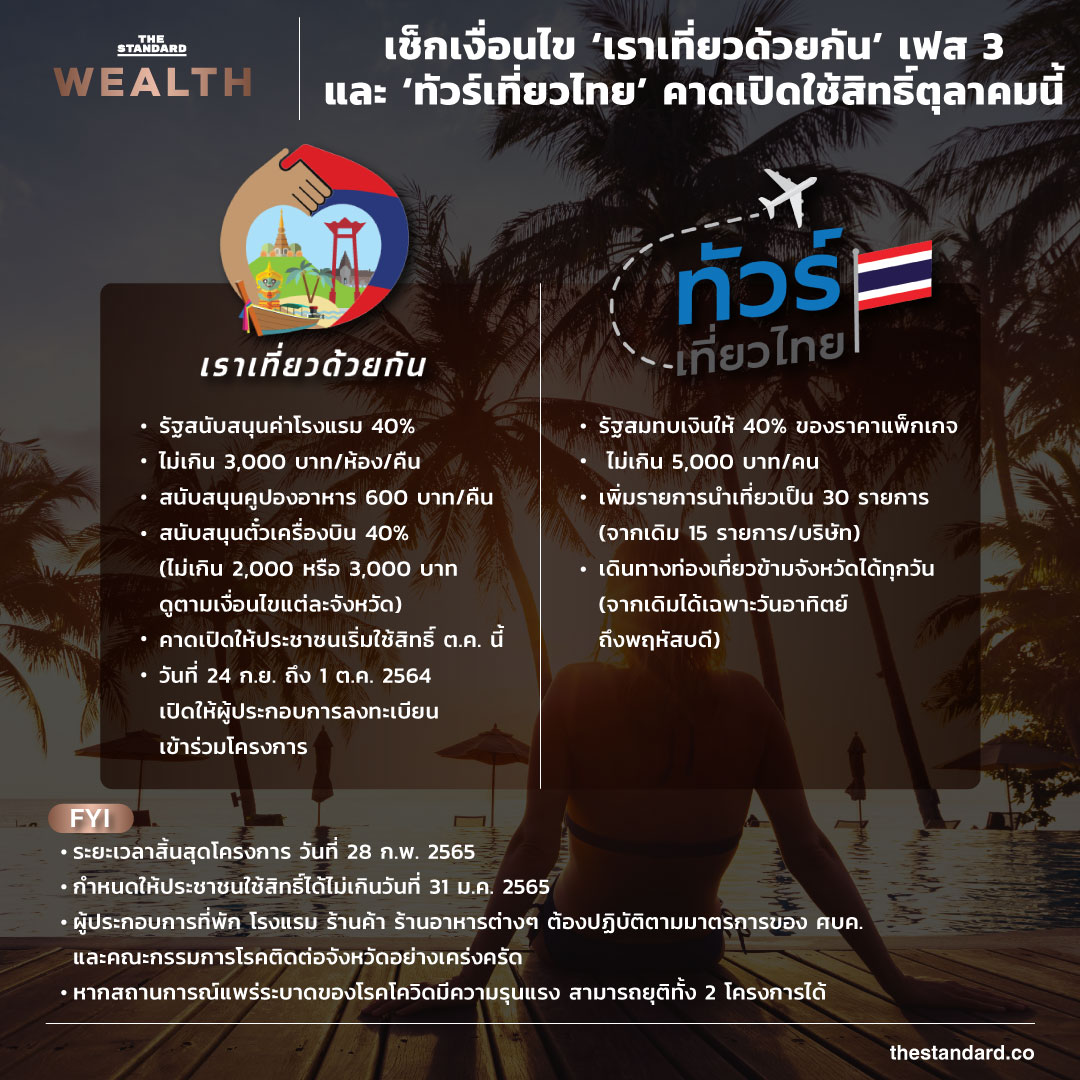 ครม. เปิดไฟเขียวให้การท่องเที่ยวแห่งประเทศไทย (ททท.) ปรับปรุงรายละเอียดที่เป็นสาระสำคัญของ โครงการเราเที่ยวด้วยกัน เฟส 3 และ โครงการทัวร์เที่ยวไทย โดยเปลี่ยนแปลงระยะเวลาสิ้นสุดการดำเนินโครงการทั้ง 2 โครงการ เป็นวันที่ 28 กุมภาพันธ์ 2565 และกำหนดให้ประชาชนใช้สิทธิ์ได้ไม่เกินวันที่ 31 มกราคม 2565 พร้อมให้ ททท. เร่งรัดการเบิกจ่ายให้แล้วเสร็จภายใน 1 เดือน