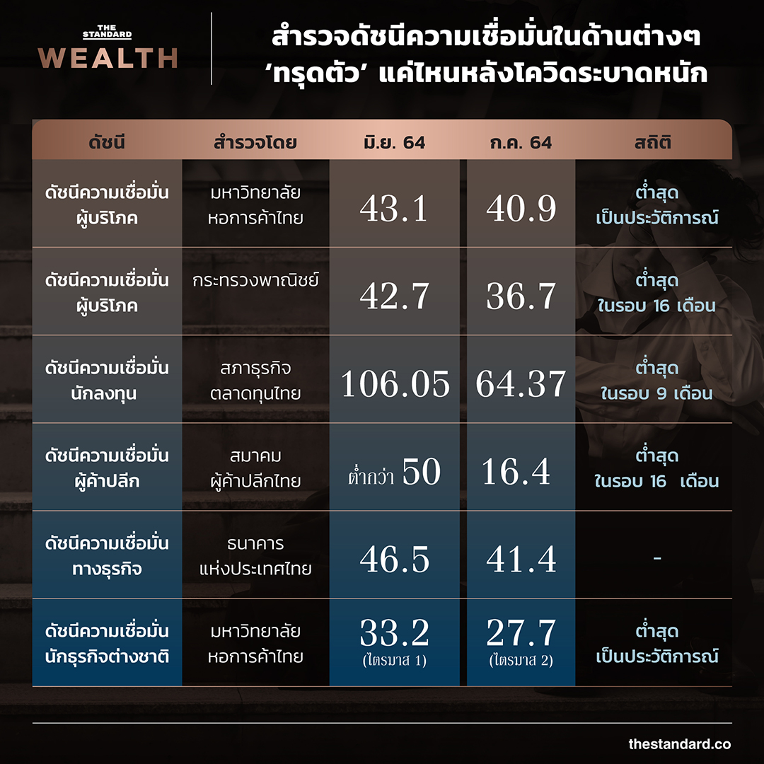 สะท้อนได้จาก ‘ดัชนีชี้วัด’ ที่ถูกจัดทำโดยหลายๆ หน่วยงานทั้งจากภาครัฐและเอกชน ที่ล้วนบ่งชี้ไปในทางเดียวกันว่าความเชื่อมั่นต่อภาวะเศรษฐกิจของคนไทยได้ปรับตัวลดลงทำสถิติใหม่อย่างต่อเนื่อง และยังมีแนวโน้มลดลงได้อีกในอนาคตหากวิกฤตการแพร่ระบาดยังไม่สามารถคลี่คลายโดยเร็ว ทีมข่าว THE STANDARD WEALTH พาไปดูว่ามีดัชนีใดบ้างที่ทรุดตัวลงไป