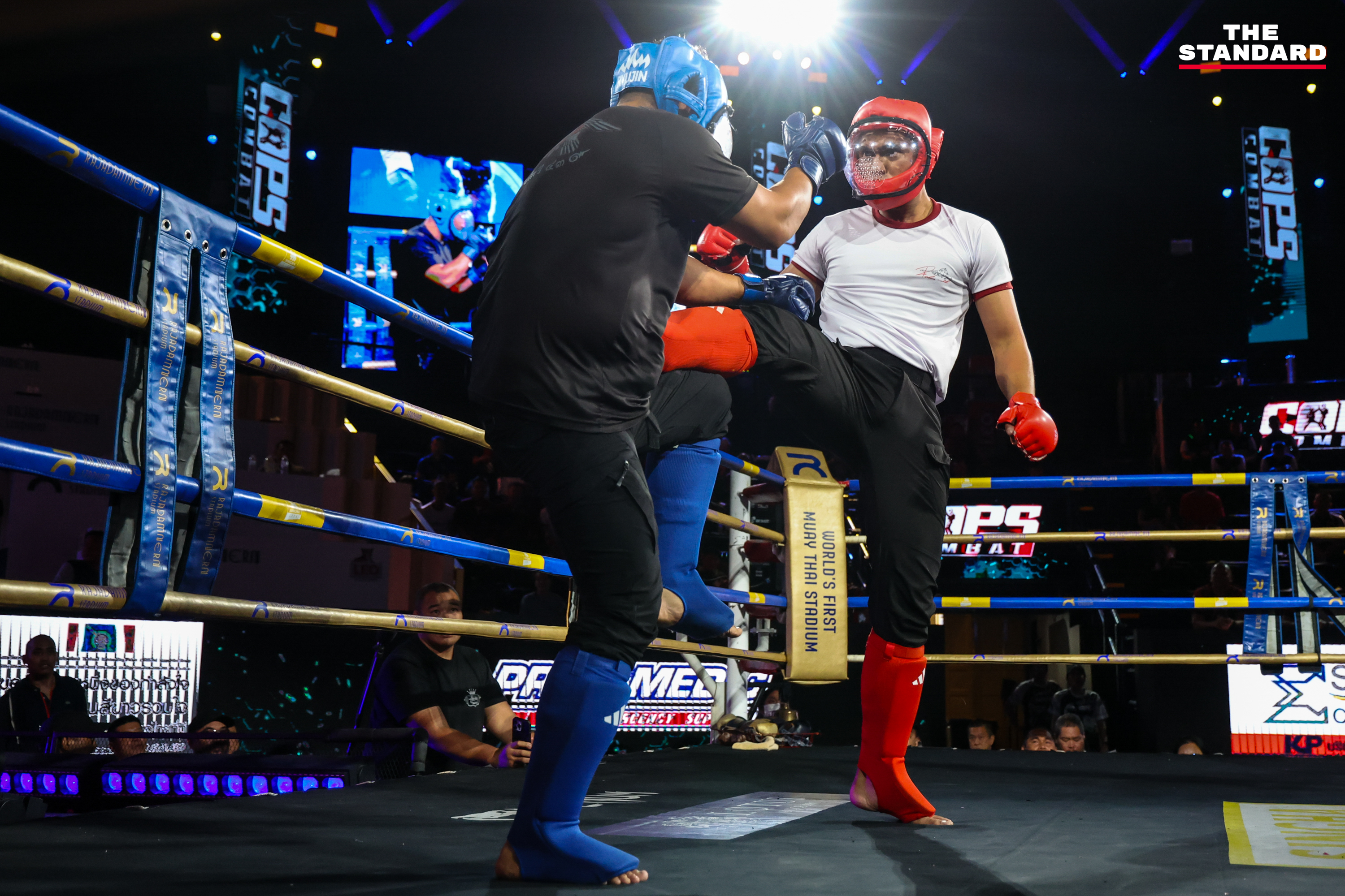 ที่เวทีมวยราชดำเนิน วันนี้ (6 พฤษภาคม) คึกคักเป็นพิเศษ ด้วยบรรยากาศการแข่งขันกีฬาต่อสู้ป้องกันตัวของตำรวจในรายการ ‘Cops Combat’ ซึ่งช่างภาพข่าว THE STANDARD ได้ลงพื้นที่เก็บภาพความดุเดือดเร้าใจ โดยมีนักกีฬาทั้งตำรวจชายและหญิงจากหลากหลายสังกัดทยอยขึ้นสังเวียนโชว์ทักษะอย่างต่อเนื่อง ท่ามกลางเสียงเชียร์ให้กำลังใจจากเพื่อนข้าราชการตำรวจและประชาชนที่มาร่วมชมและร่วมลุ้นกันอย่างสนุกสนานติดขอบเวที