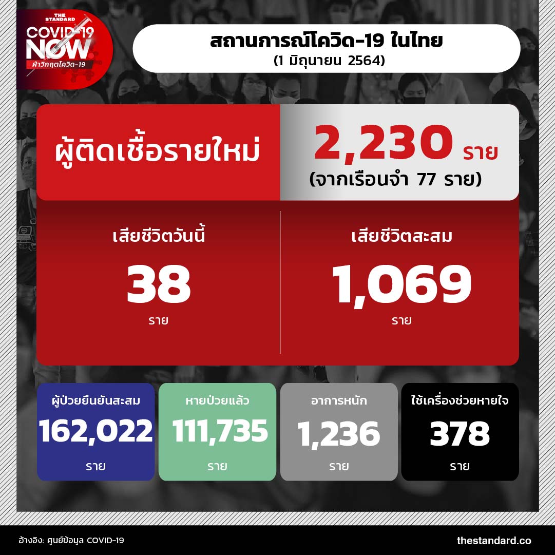 วันนี้ (1 มิถุนายน) สถานการณ์โควิด-19 ในประเทศไทย พบผู้ป่วยรายใหม่เพิ่ม 2,230 ราย แบ่งเป็นติดเชื้อจากต่างประเทศ 21 ราย ติดเชื้อภายในประเทศ 2,132 ราย มาจากเรือนจำ 77 ราย
