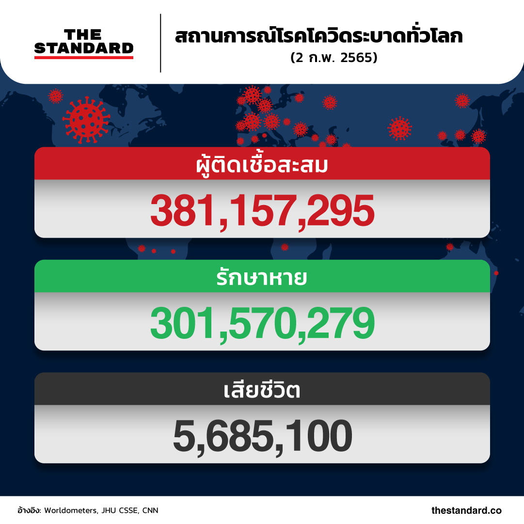 วันนี้ (2 กุมภาพันธ์) ยอดผู้ติดโควิดสะสมพุ่งสูงกว่า 381 ล้านรายทั่วโลก หลังการแพร่ระบาดผ่านมานานกว่า 2 ปีแล้ว ยอดผู้เสียชีวิตสูงกว่า 5.6 ล้านราย อัตราเสียชีวิตอยู่ที่ราว 1.6% รักษาหายแล้วราว 80% ของผู้ติดเชื้อทั้งหมด ขณะนี้มีประเทศที่พบผู้ติดเชื้อแล้ว 189 จาก 193 ประเทศทั่วโลก โดยประเทศที่ยังไม่พบผู้ติดเชื้อรายแรกอย่างเป็นทางการได้แก่ เกาหลีเหนือ เติร์กเมนิสถาน ตูวาลู และนาอูรู